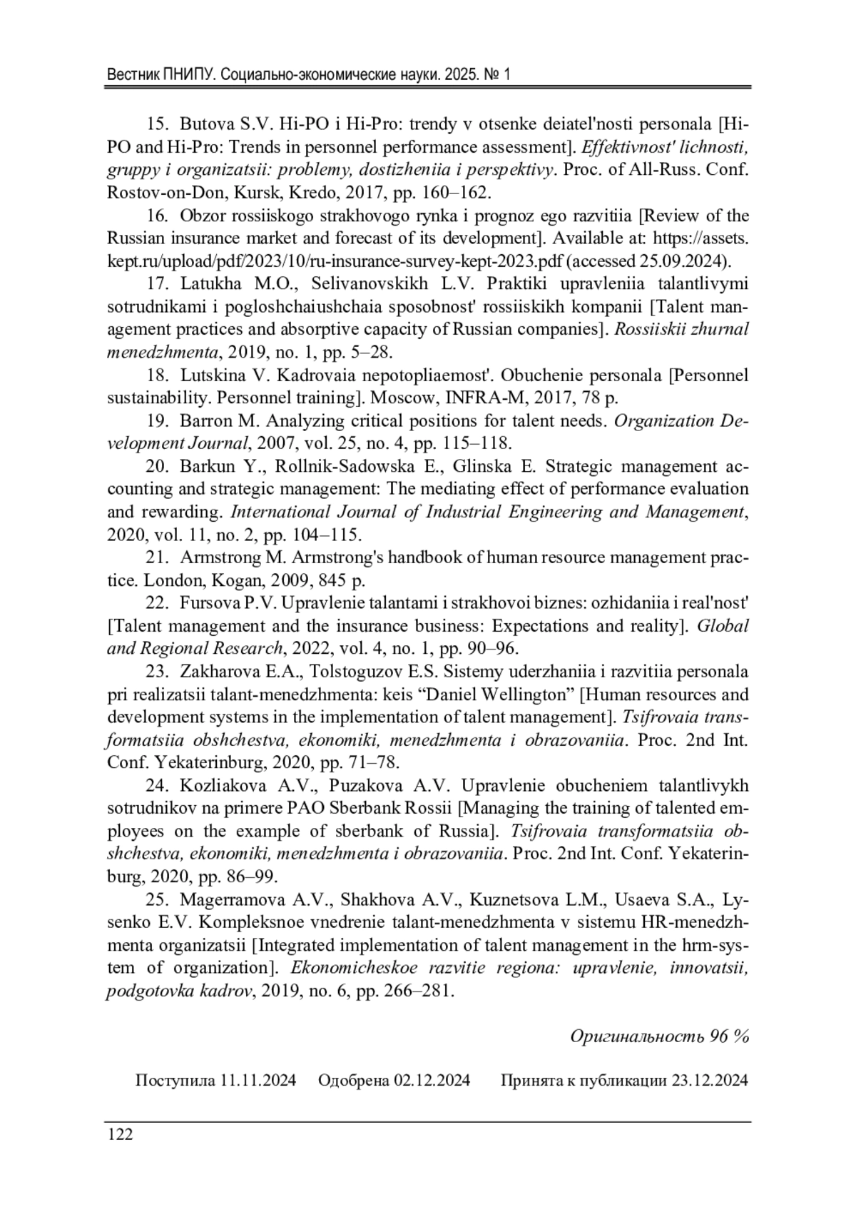 22. Фурсова, П.В. Управление талантами и страховой бизнес: ожидания и реальность / П.В. Фурсова // Global and Regional Research. - 2022. - Т. 4, № 1. - С. 90-96. EDN: EMOHIJ