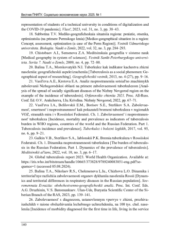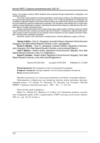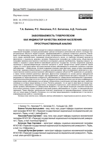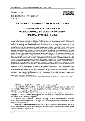 БАЛИНА Т. А., НИКОЛАЕВ Р. С., БАТАЛОВА Л. С., УСОЛЬЦЕВ А. Д. ЗАБОЛЕВАЕМОСТЬ ТУБЕРКУЛЕЗОМ КАК ИНДИКАТОР КАЧЕСТВА ЖИЗНИ НАСЕЛЕНИЯ: ПРОСТРАНСТВЕННЫЙ АНАЛИЗ // ВЕСТНИК ПЕРМСКОГО НАЦИОНАЛЬНОГО ИССЛЕДОВАТЕЛЬСКОГО ПОЛИТЕХНИЧЕСКОГО УНИВЕРСИТЕТА. СОЦИАЛЬНО-ЭКОНОМИЧЕСКИЕ НАУКИ. 2025. № 1