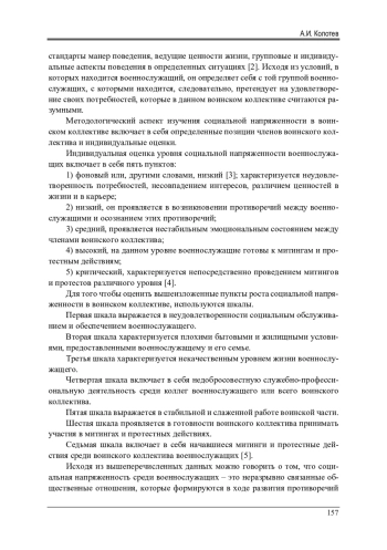Изучена личная оценка уровня социальной напряженности военнослужащих в воинском коллективе. Каждый из представленных уровней подробно описывает индивидуальные потребности военнослужащего и его родственников. Выделены социологические шкалы, которые позволяют сделать оценку методологическим аспектам. Каждая рассмотренная шкала включает в себя неудовлетворенность и некачественные условия жизни и труда военнослужащих. Изучены параметры оценки социальной напряженности и рассмотрена их специализация. При изучении параметров оценки были выявлены и изучены эмпирические показатели, в которых проявляется социальная напряженность. При рассмотрении эмпирических показателей были выделены методы для диагностики социальной напряженности. Полученные методы легли в основу изучения социальной напряженности военнослужащих в воинском коллективе. В ходе рассмотрения параметров оценки были получены результаты о критериях, которые влияют на качественные и количественные показатели социальной напряженности. Проведен теоретический анализ ключевых аспектов, которые позволил сформировать гипотезы и получить представления о социальной напряженности как самостоятельном феномене. При изучении социальной напряженности была рассмотрена индивидуальная оценка уровня социальной напряженности. Детально рассмотрены категории социальной напряженности. Каждая из четырех категорий включает в себя широкий спектр как личных, так и общих аспектов, из-за которых социальная напряженность увеличивается или уменьшается в ту или иную сторону. Сформированы этапы гипотезы, которые легли в основу методологического комплекса изучения социальной напряженности среди военнослужащих. Сформированная гипотеза включает в себя четыре этапа, при соблюдении условий по каждому этапу уровень социальной напряженности в воинском коллективе среди военнослужащих будет минимальным.