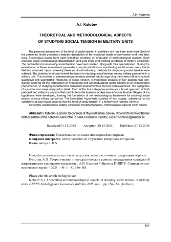 КОЛОТЕВ А. И. ТЕОРЕТИЧЕСКИЕ И МЕТОДОЛОГИЧЕСКИЕ АСПЕКТЫ ИССЛЕДОВАНИЯ СОЦИАЛЬНОЙ НАПРЯЖЕННОСТИ В ВОИНСКОМ КОЛЛЕКТИВЕ // ВЕСТНИК ПЕРМСКОГО НАЦИОНАЛЬНОГО ИССЛЕДОВАТЕЛЬСКОГО ПОЛИТЕХНИЧЕСКОГО УНИВЕРСИТЕТА. СОЦИАЛЬНО-ЭКОНОМИЧЕСКИЕ НАУКИ. 2025. № 1