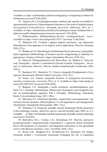 30. Адамова, К.З. Квазиинтегрированные структуры как результат новейших интеграционных процессов [Электронный ресурс] / К.З. Адамова // Промышленность: экономика, управление, технологии. - 2011. - № 1. - URL: https://cyberleninka.ru/article/n/kvaziintegrirovannye-struktury-kak-rezultat-noveyshih-integratsionnyh-protsessov (дата обращения: 13.06.2024). EDN: OHWNGH