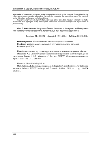 Анализируются мероприятия по совершенствованию технологических процессов на заводе. Проводится оценка повышения показателей эффективности деятельности предприятия. Актуальность исследования в том, что анализируются экономические последствия модернизации производства амортизаторов на примере Первоуральского автоагрегатного завода. Исследование направлено на оценку влияния внедрения новых технологий на производственный процесс, качество продукции, себестоимость и конкурентоспособность на рынке. Особое внимание уделено социальным изменениям, включая эффекты на уровень занятости и условия труда в регионе Первоуральска. Отмечается, что в процессе модернизации показатели рентабельности завода существенно выросли за счет сокращения затрат и повышения эффективности производства. Обоснована необходимость применения эффективных подходов к экономическим последствиям от модернизации амортизаторов для автоиндустрии России в целом, что может способствовать повышению устойчивости и развитию предпринимательской деятельности, а также оптимизации инвестиционных процессов в условиях повышенной неопределенности на данный момент времени. Разработаны некоторые рекомендации, повышающие конкурентоспособность завода, позволяющие адаптироваться к изменяющимся условиям на рынке.
