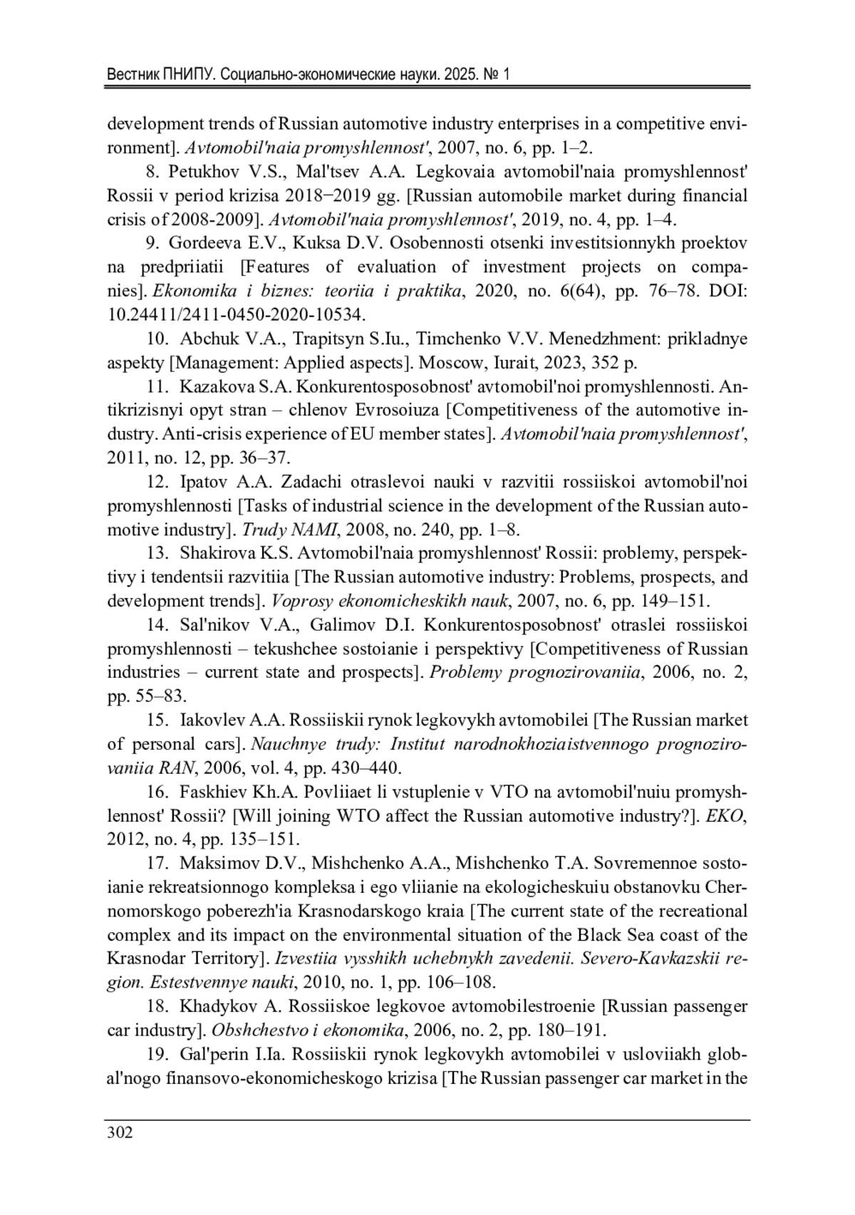 8. Петухов, В.С. Легковая автомобильная промышленность России в период кризиса 2018-2019 гг. / В.С. Петухов, А.А. Мальцев // Автомобильная промышленность. - 2019. - № 4. - С. 1-4.