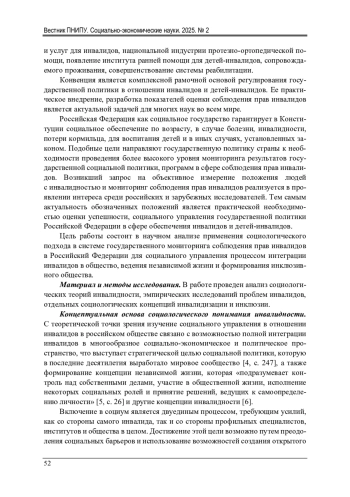 Введение. В Российской Федерации формируется новая модель социального управления, связанная с обеспечением равных прав и возможностей для их интеграции инвалидов в общество, для достижения реальной социальной инклюзии, улучшения качества их жизни и решения сложившихся социальных проблем, а также обеспечения реализации комплексной реабилитации. В условиях социальных изменений и формирования новой государственной политики инвалидности крайне важно получать обратную связь от самих социальных акторов – инвалидов, общественных организаций и других заинтересованных лиц. Данная потребность реализуется в рамках проведения мониторинга оценки успешности государственной политики, программ, проектов, что характеризуется социально-инновационной моделью социальной политики инвалидности в страны