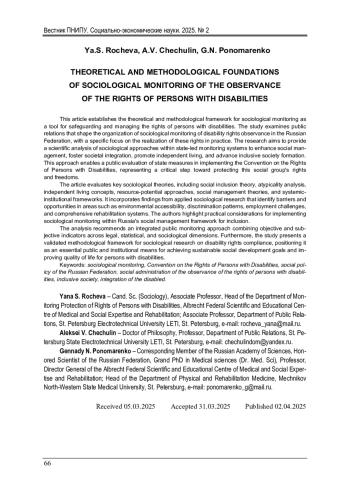 Представлены теоретико-методологические основания проведения социологического мониторинга и его роль в управлении соблюдением прав инвалидов. Объект исследования - общественные отношения, определяющие основные подходы к организации социологического мониторинга соблюдения прав инвалидов в Российской Федерации. Предметом исследования являются права инвалидов и возможности их реализации в России. Цель работы состоит в научном анализе применения социологического подхода в системе государственного мониторинга соблюдения прав инвалидов в Российский Федерации, для социального управления процессом интеграции инвалидов в общество, ведения независимой жизни и формирования инклюзивного общества. Он обеспечивает осуществление общественной оценки действий государства в контексте реализации Конвенции, что представляет собой важный шаг к обеспечению прав и свобод данной социальной группы. Проведен анализ социологических теорий (теория социальной инклюзии, анализ нетипичности, концепции независимой жизни и ресурсно-потенциальный подход, теории социального управления, системный и институциональный подходы), результатов прикладных социологических исследований, иллюстрирующих барьеры и возможности доступности среды, дискриминации, трудоустройства, комплексной реабилитации, репрезентации людей с инвалидностью и др. Обозначены практические вопросы применения социологического мониторинга в социальном управлении формирования инклюзивного общества в России. В результате анализа обозначено применение комплексного подхода в государственной системе мониторинга соблюдения прав инвалидов, основанного на сочетании объективных и субъективных показателей правового, статистического и социологического компонентов. Предложена апробированная методика социологического исследования соблюдения прав инвалидов как общественно-государственного инструмента обеспечения целей устойчивого развития социальной сферы и улучшения положения людей с инвалидностью.