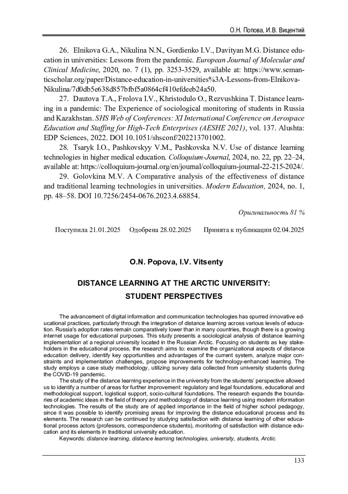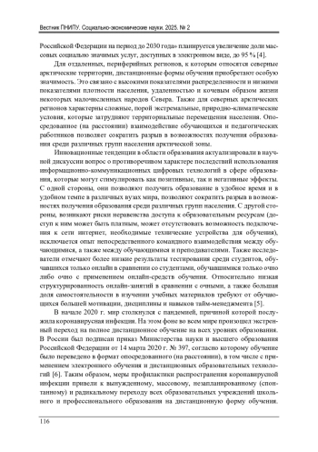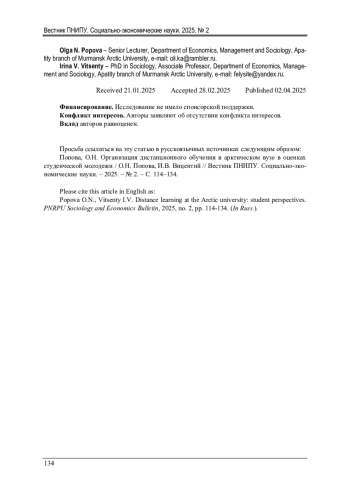 ПОПОВА О. Н., ВИЦЕНТИЙ И. В. ОРГАНИЗАЦИЯ ДИСТАНЦИОННОГО ОБУЧЕНИЯ В АРКТИЧЕСКОМ ВУЗЕ В ОЦЕНКАХ СТУДЕНЧЕСКОЙ МОЛОДЕЖИ // ВЕСТНИК ПЕРМСКОГО НАЦИОНАЛЬНОГО ИССЛЕДОВАТЕЛЬСКОГО ПОЛИТЕХНИЧЕСКОГО УНИВЕРСИТЕТА. СОЦИАЛЬНО-ЭКОНОМИЧЕСКИЕ НАУКИ. 2025. № 2