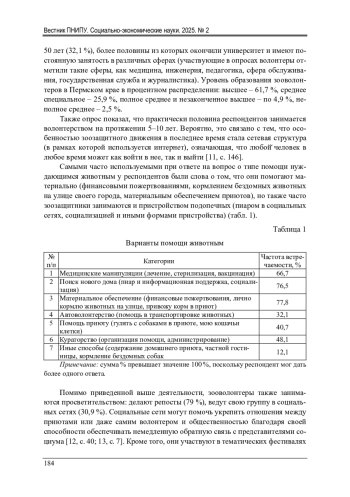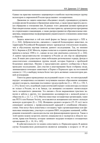 Зоозащитное волонтерство, действующее преимущественно на основе частной инициативы, сталкивается с колоссальными сложностями. Это связано с тем, что в России оно появилось относительно недавно, и законодательство в сфере обращения с животными все еще находится в процессе формирования. В отличие от волонтеров, занятых в других сферах, зоозащитники зачастую вынуждены самостоятельно бороться с проблемами правового регулирования, отсутствием достаточной инфраструктуры для передержки животных и негативным отношением со стороны части общества. Поддержка со стороны государства, хоть и существует в теории, редко достигает реально нуждающихся приютов и индивидуальных волонтеров. Это приводит к тому, что зооволонтеры вынуждены работать в условиях ограниченных ресурсов, полагаясь исключительно на собственные средства и пожертвования неравнодушных граждан. Они занимаются отловом, лечением, стерилизацией и пристройством животных, а также ведут активную просветительскую работу, направленную на формирование ответственного отношения к питомцам. На основе результатов социологического исследования рассматривается портрет личности медианного зооволонтера из Пермского края. Анализируются основные типы помощи со стороны зоозащитников; категории животных, с которыми им приходится работать; мотивация участия зооволонтеров в данной деятельности. В статье предлагается общий обзор вопросов, связанных с организационными аспектами зооволонтерства, способами координации деятельности, а также ролью социальных сетей в распространении информации о проблемах защиты животных. Исследование подробно освещает то, что зоозащитники зачастую готовы жертвовать своими интересами, идти на конфликты с близкими и испытывать денежные проблемы ради спасения жизней животных, что характеризует их как людей с волевыми чертами характера, имеющими направленность на дело.