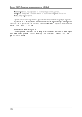 ДУВАНСКАЯ М. К., ШМАКОВА С. Р. ИССЛЕДОВАНИЕ МОТИВАЦИИ ВОЛОНТЕРОВ ПЕРМСКОГО КРАЯ И ПОРТРЕТ ИХ ЛИЧНОСТИ // ВЕСТНИК ПЕРМСКОГО НАЦИОНАЛЬНОГО ИССЛЕДОВАТЕЛЬСКОГО ПОЛИТЕХНИЧЕСКОГО УНИВЕРСИТЕТА. СОЦИАЛЬНО-ЭКОНОМИЧЕСКИЕ НАУКИ. 2025. № 2