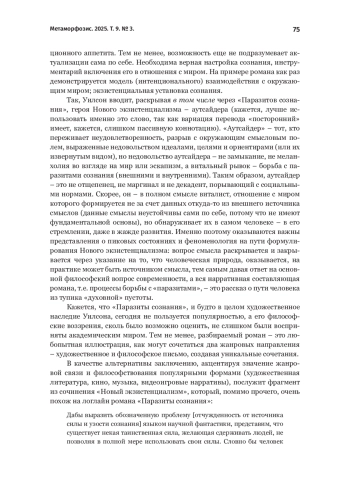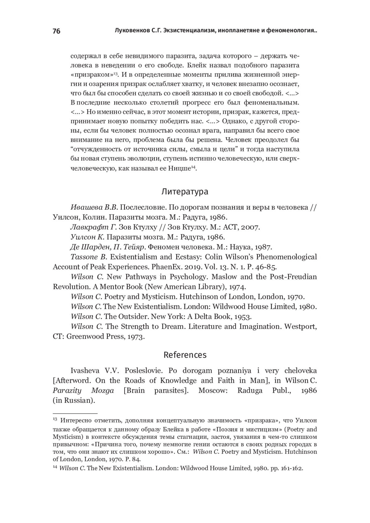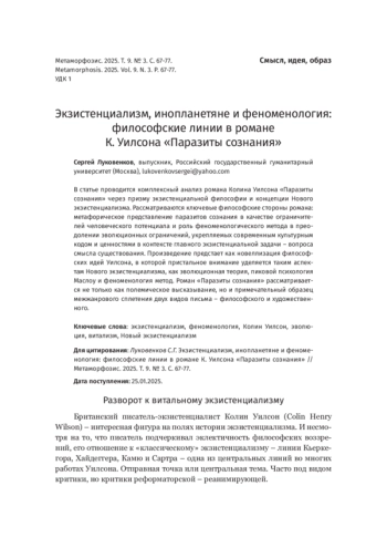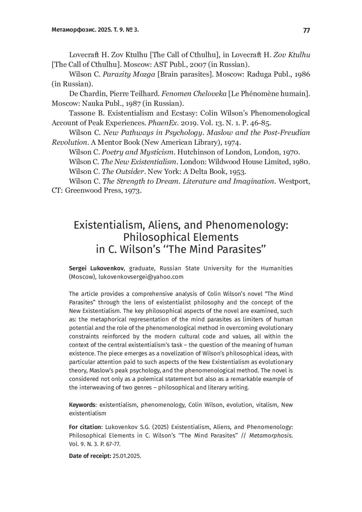 ЛУКОВЕНКОВ С. ЭКЗИСТЕНЦИАЛИЗМ, ИНОПЛАНЕТЯНЕ И ФЕНОМЕНОЛОГИЯ: ФИЛОСОФСКИЕ ЛИНИИ В РОМАНЕ К. УИЛСОНА «ПАРАЗИТЫ СОЗНАНИЯ» // МЕТАМОРФОЗИС. 2025. ТОМ 9, № 3