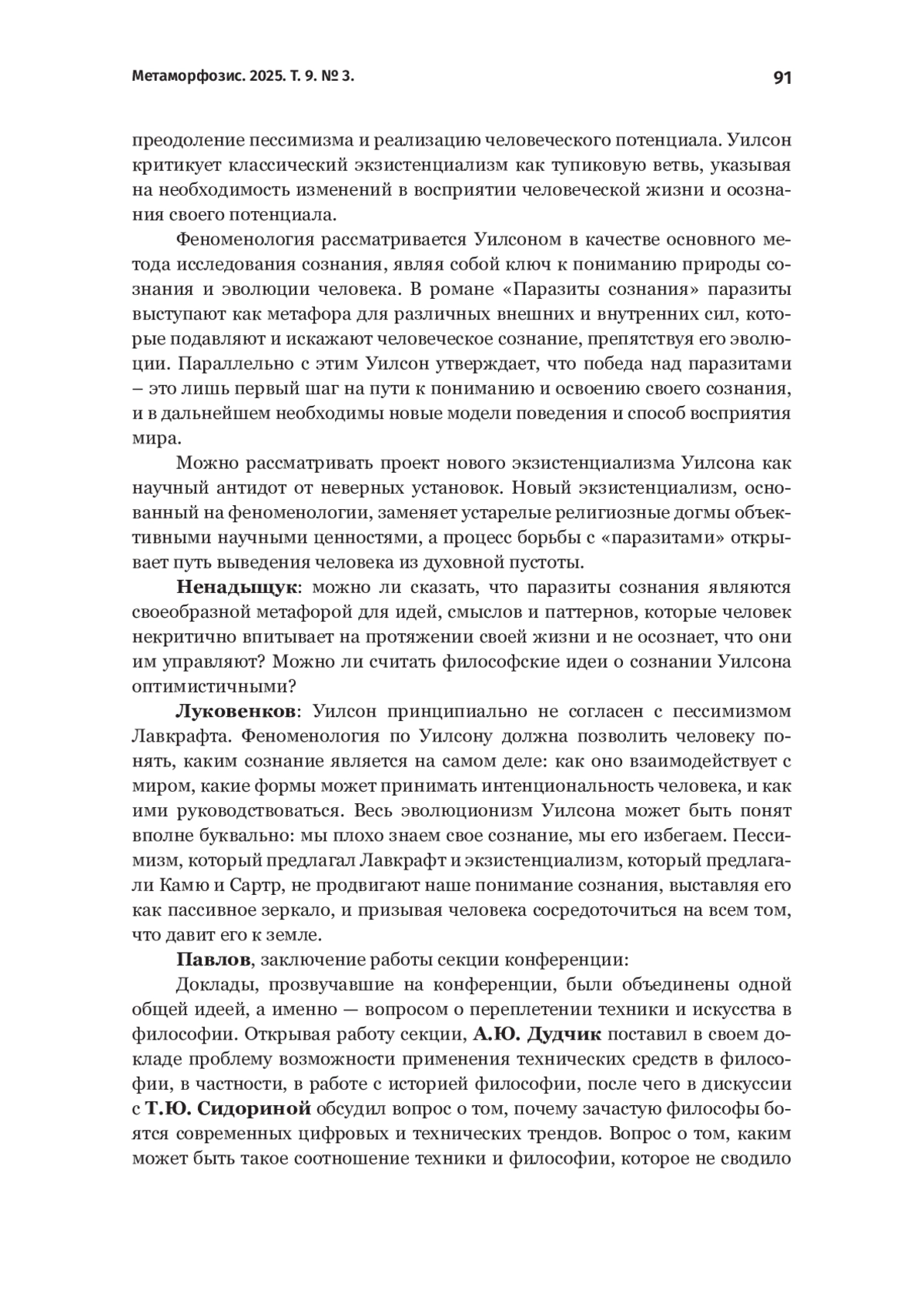 В статье проводится комплексный анализ романа Колина Уилсона «Паразиты сознания» через призму экзистенциальной философии и концепции Нового экзистенциализма. Рассматриваются ключевые философские стороны романа: метафорическое представление паразитов сознания в качестве ограничителей человеческого потенциала и роль феноменологического метода в преодолении эволюционных ограничений, укрепляемых современным культурным кодом и ценностями в контексте главного экзистенциальной задачи – вопроса смысла существования. Произведение предстает как новеллизация философских идей Уилсона, в которой пристальное внимание уделяется таким аспектам Нового экзистенциализма, как эволюционная теория, пиковой психология Маслоу и феноменология метод. Роман «Паразиты сознания» рассматривается не только как полемическое высказывание, но и примечательный образец межжанрового сплетения двух видов письма – философского и художественного.
