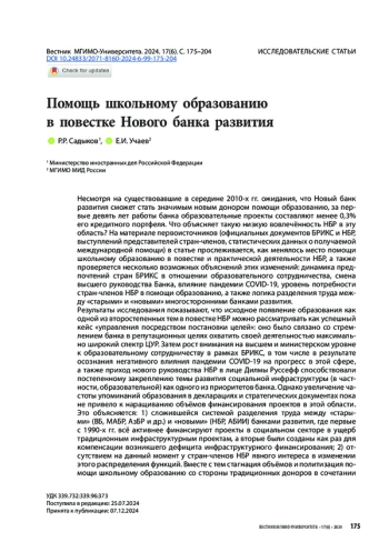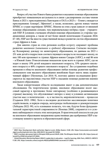 Несмотря на существовавшие в середине 2010-х годов ожидания, что Новый банк развития сможет стать значимым новым донором помощи образованию, за первые девять лет работы банка образовательные проекты составляют менее 0,3% его кредитного портфеля. Что объясняет такую низкую вовлеченность НБР в эту область? На материале первоисточников (официальных документов БРИКС и НБР, выступлений представителей стран-членов, статистических данных о получаемой международной помощи) в статье прослеживается, как менялось место помощи школьному образованию в повестке и практической деятельности НБР, а также проверяется несколько возможных объяснений этих изменений: динамика предпочтений стран БРИКС в отношении образовательного сотрудничества, смена высшего руководства Банка, влияние пандемии COVID-19, уровень потребности стран-членов НБР в помощи образованию, а также логика разделения труда между «старыми» и «новыми» многосторонними банками развития. Результаты исследования показывают, что исходное появление образования как одной из второстепенных тем в повестке НБР можно рассматривать как успешный кейс «управления посредством постановки целей»: оно было связано со стремлением банка в репутационных целях охватить своей деятельностью максимально широкий спектр ЦУР. Затем рост внимания на высшем и министерском уровне к образовательному сотрудничеству в рамках БРИКС, в том числе в результате осознания негативного влияния пандемии COVID-19 на прогресс в этой сфере, а также приход нового руководства НБР в лице Дилмы Руссефф способствовали постепенному закреплению темы развития социальной инфраструктуры (в частности, образовательной) как одного из приоритетов банка. Однако увеличение частоты упоминаний образования в декларациях и стратегических документах пока не привело к наращиванию объёмов финансирования проектов в этой области. Это объясняется: 1) сложившейся системой разделения труда между «старыми» (ВБ, МАБР, АзБР и др.) и «новыми» (НБР, АБИИ) банками развития, где первые с 1990-х годов всё активнее финансируют проекты в социальном секторе в ущерб традиционным инфраструктурным проектам, а вторые были созданы как раз для компенсации возникшего дефицита инфраструктурного финансирования; 2) отсутствием на данный момент у стран-членов НБР явного интереса в изменении этого распределения функций. Вместе с тем, стагнация объёмов и политизация помощи школьному образованию со стороны традиционных доноров в сочетании с сохраняющейся потребностью многих развивающихся стран в международном содействии развитию своих образовательных систем делает актуальной для БРИКС задачу совершенствования механизмов образовательного сотрудничества как внутри объединения, так и с другими странами мирового большинства.
