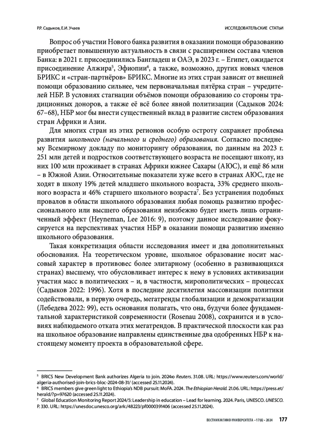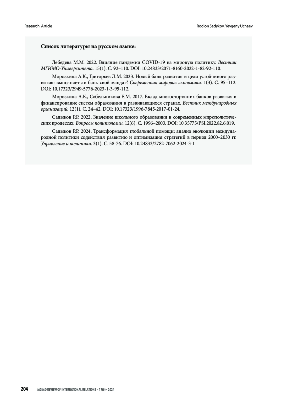25. Садыков Р.Р. 2024. Трансформация глобальной помощи: анализ эволюции международной политики содействия развитию и оптимизация стратегий в период 2000-2030 гг.