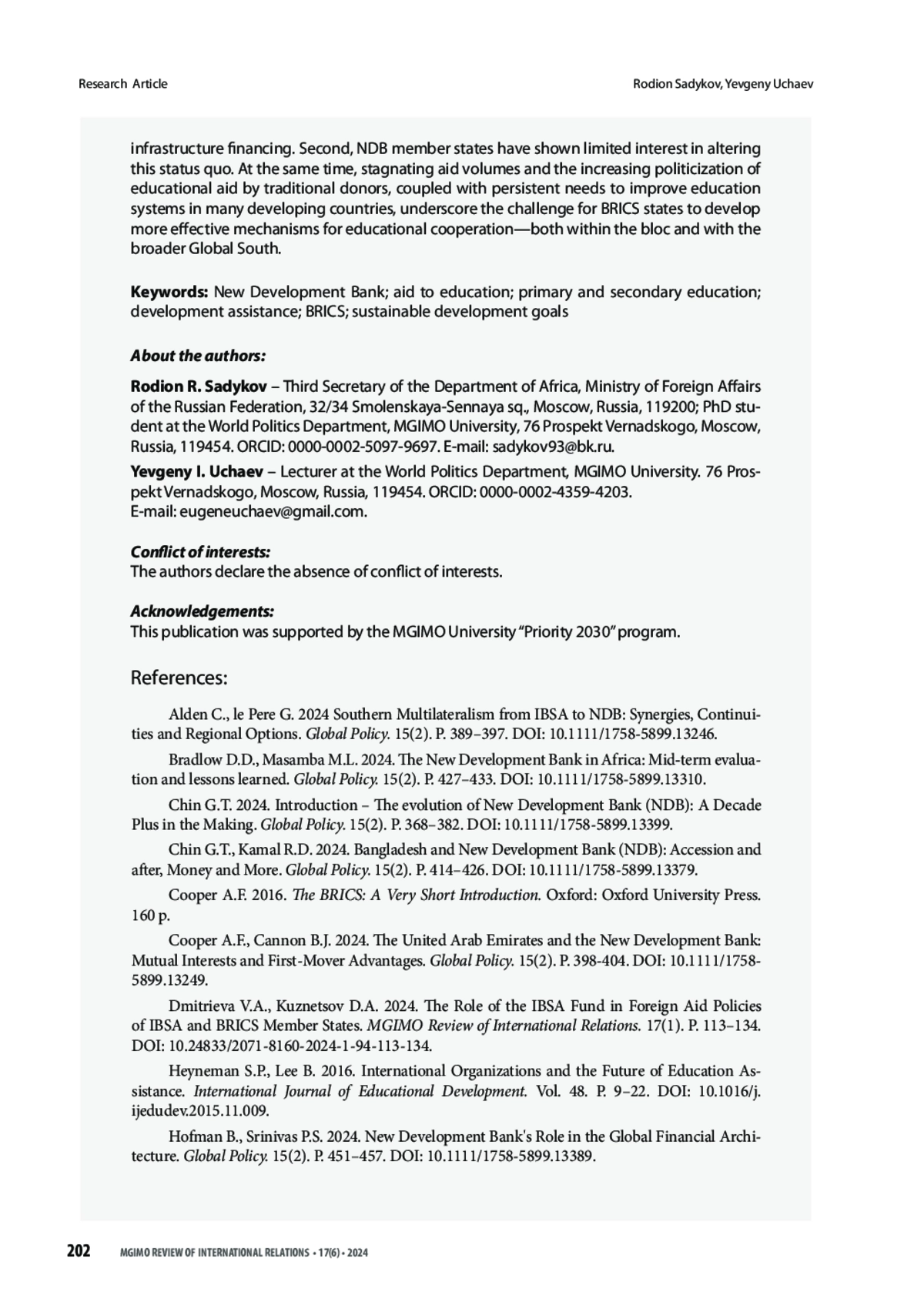 6. Cooper A.F., Cannon B.J. 2024. The United Arab Emirates and the New Development Bank: Mutual interests and first-mover advantages. Global Policy. 15(2). P. 398-404. https://doi.org/10.1111/17585899.13249.