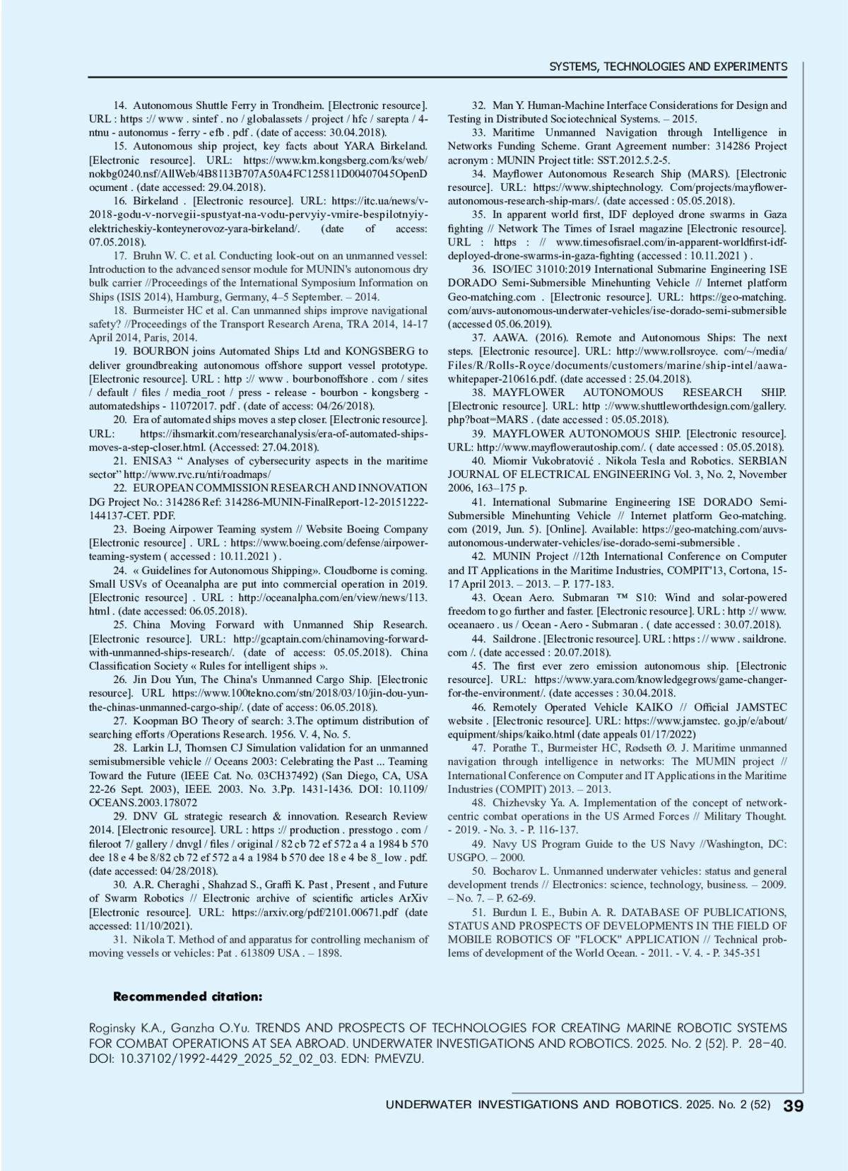 68. Bruhn W. C. et al. Conducting look-out on an unmanned vessel: Introduction to the advanced sensor module for MUNIN’s autonomous dry bulk carrier //Proceedings of the International Symposium Information on Ships (ISIS 2014), Hamburg, Germany, 4-5 September. - 2014.