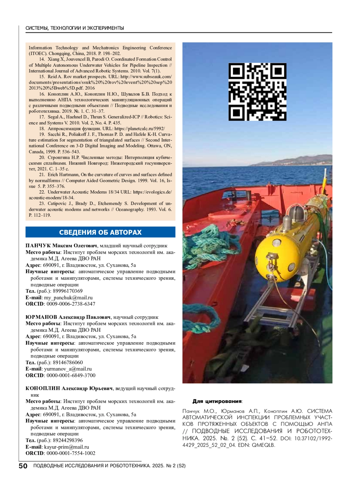 16. Коноплин А.Ю., Коноплин Н.Ю., Шувалов Б.В. Подход к выполнению АНПА технологических манипуляционных операций с различными подводными объектами // Подводные исследования и робототехника. 2019. №. 1. С. 31-37.