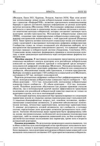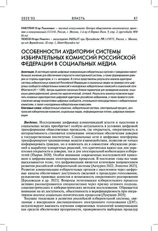 В настоящее время цифровые коммуникации избирательных органов с гражданами имеют большое значение для обеспечения открытости электоральной системы, а также формирования доверия со стороны аудитории, в т. ч. молодежи. В статье представлены результаты анализа аудитории системы избирательных комиссий Российской Федерации в социальных медиа на примере сети цифровых сообществ избирательных комиссий и молодежных избирательных комиссий в социальной сети ВКонтакте (N = 1 020). Авторы выделили несколько блоков параметров для проведения анализа: социально-демографический, ценностно-идеологический, сетевой. Результаты анализа позволили выделить основные характеристики цифровой аудитории российских избиркомов, а также провести сопоставление между показателями цифровых сообществ, относящихся непосредственно к избирательным комиссиям, а также к молодежным избирательным комиссиям.