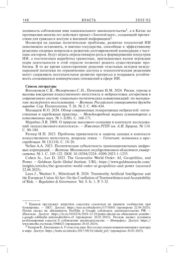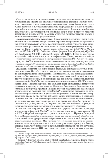 1. Володенков С.В., Федорченко С.Н., Печенкин Н.М. 2024. Риски, угрозы и вызовы внедрения искусственного интеллекта и нейросетевых алгоритмов в современную систему социально-политических коммуникаций: по материалам экспертного исследования. - Вестник Российского университета дружбы народов. Сер. Политология. Т. 26. № 2. С. 406-424. EDN: LWSYCV