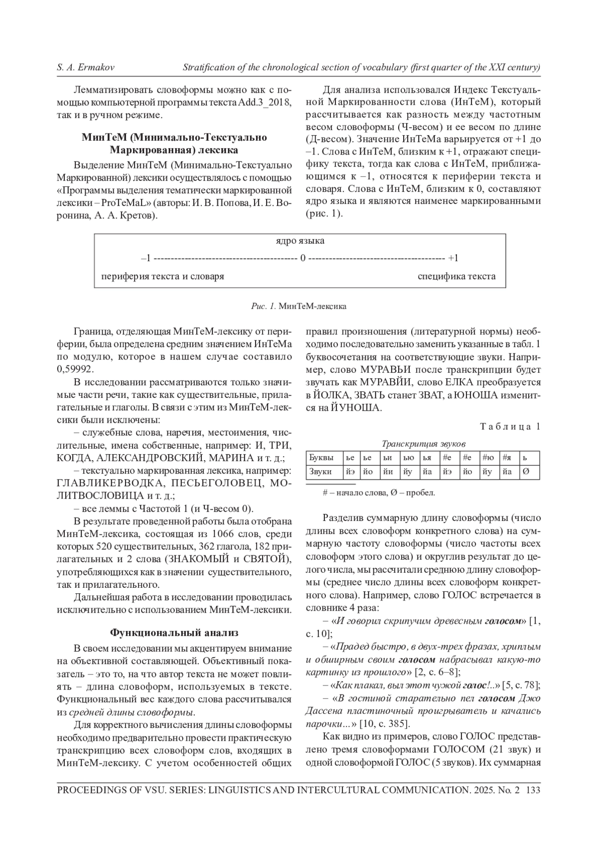 В предложенной статье подробно описан эксперимент по системной стратификации хронологического среза лексики первой четверти XXI в. Цель эксперимента - выявить ключевые аспекты лексической системы языка и определить, какие слова составляют ядро лексики, а какие относятся к периферии. Анализ ядерной лексики, особенно в динамике через хронологические срезы, позволяет лучше понять и изучить процессы, происходящие в лексической системе языка. Выявление изменений, происходящих в ядре лексики (количественных и качественных), имеет первостепенное значение для исследования, так как именно эти изменения наиболее важны для системы языка. Параметрический анализ лексики (ПАЛ) является ценным инструментом для определения системного ядра лексики. ПАЛ включает четыре основных параметра: функциональный, синтагматический, деривационный и парадигматический. Только учет всех четырех параметров дает полное представление о положении слова в иерархии лексико-семантической системы языка, что позволяет исследователям точнее оценивать значимость и влияние отдельных лексических единиц. Статья также содержит детальный обзор параметрического анализа лексики - от подготовки словника и его конкорданса до выделения МинТеМ-лексики, вычисления веса каждого слова по указанным параметрам и анализа результатов исследования. Кроме того, статья описывает оригинальные подходы и решения, использованные в ходе работы, которые могут быть полезны для дальнейших исследований в области исторической лексикологии и изучения лексико-семантической системы современного русского языка. Полагаем, что данная статья внесет вклад в современную лексикологию и может служить основой для будущих исследований в области лексико-семантической системы языка.