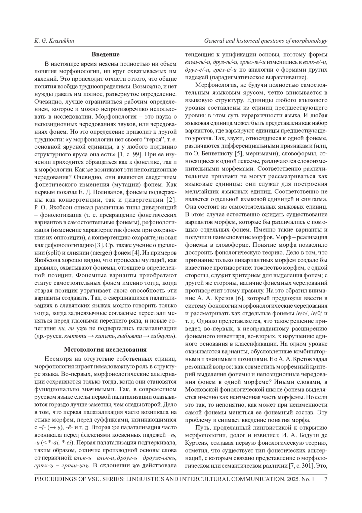 КРАСУХИН К. Г. ОБЩИЕ И ИСТОРИЧЕСКИЕ ВОПРОСЫ МОРФОНОЛОГИИ // ВЕСТНИК ВОРОНЕЖСКОГО ГОСУДАРСТВЕННОГО УНИВЕРСИТЕТА. СЕРИЯ: ЛИНГВИСТИКА И МЕЖКУЛЬТУРНАЯ КОММУНИКАЦИЯ. 2025. № 1