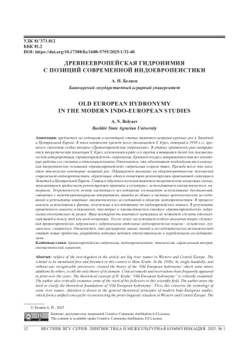 Предметом исследования в настоящей статье являются названия крупных рек в Западной и Центральной Европе. В этом контексте прежде всего упоминается Х. Краэ, который в 1950-х гг. прошлого столетия создал теорию «Древнеевропейская гидронимия». В статье критически рассматривается теоретическая концепция Х. Краэ, изложенная в ряде его трудов и явившаяся базой для лингвистической интерпретации «древнеевропейской» гидронимии. Критически рассматриваются также некоторые работы его учеников и единомышленников. Отмечается, что объективная необходимость в освещении теоретических оснований «древнеевропейской» гидронимии созрела давно. Прежде всего это касается этимологии некоторых названий рек. Обращается внимание на общетеоретические положения современной индоевропеистики, образующие единую концепцию реконструкции праязыковой ситуации в Западной и Центральной Европе. Главным объектом изучения являются теоретические концепции ученых, занимающихся проблемами реконструкции праязыка и культуры с использованием ономастического материала. Теоретическую основу настоящего исследования составляют использование достижений, связанных с междисциплинарными открытиями, выводы из общих и частных археологических исследований и результаты новейших лингвистических исследований в области индоевропеистики. В процессе анализа использовались факты, полученные в исследованиях по индоевропейским языкам. В результате проведенного анализа установлено, что вопрос о лингвистическом статусе «древнеевропейской» гидронимии окончательно не решен. Фрагментарность языкового материала не позволяет сделать однозначный вывод в пользу той или иной концепции. Тем не менее заслуживает особого внимания вопрос сближения древнеевропейских гидронимов с гидронимами отдельных индоевропейских языков - кельтским, германским, славянским. Отмечается, что расширение наших знаний и исследовательских возможностей ставит новые проблемы, разработка которых ведется отечественными и зарубежными исследователями.