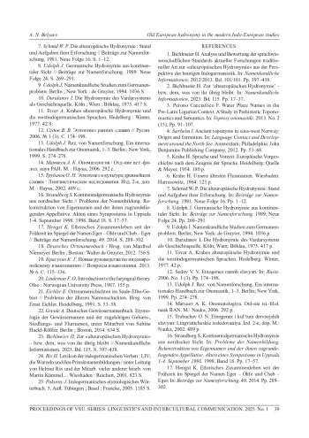 1. Bichlmeier Н. Analyse und Bewertung der sprachwissenschaftlichen Standards aktueller Forschungen traditioneller Art zur “alteuropaischen Hydronymie” aus der Perspektive der heutigen Indogermanistik // Namenkundliche Informationen. 2012/2013. Bd. 101/101. S. 397-438.