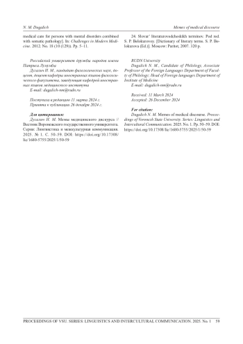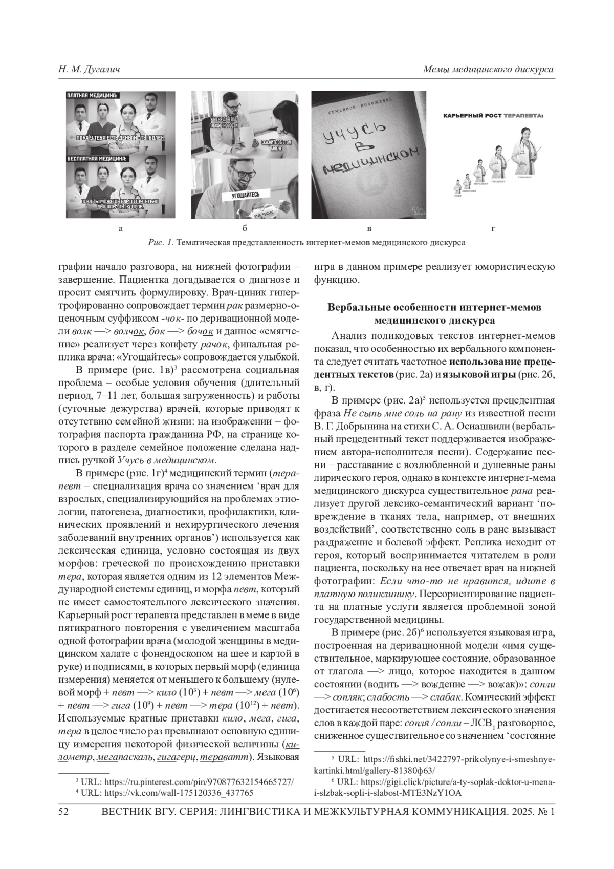 ДУГАЛИЧ Н. М. МЕМЫ МЕДИЦИНСКОГО ДИСКУРСА // ВЕСТНИК ВОРОНЕЖСКОГО ГОСУДАРСТВЕННОГО УНИВЕРСИТЕТА. СЕРИЯ: ЛИНГВИСТИКА И МЕЖКУЛЬТУРНАЯ КОММУНИКАЦИЯ. 2025. № 1