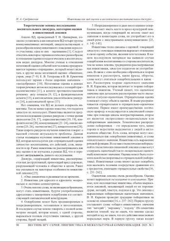 Педагогический дискурс как лингвистическое явление был достаточно хорошо описан во многих работах, при этом один из его видов – воспитательный – только начинает привлекать исследователей. Те немногочисленные лингвистические работы, которые были посвящены воспитательному дискурсу (ВД), рассматривали его жанры и стили [1; 2], динамику его ценностей [3], прагматику его коммуникативной тональности [4]. В то же время ВД имеет ряд характерных особенностей, требующих пристального внимания, среди которых – его функция оценивания, не получившая до сих пор научного освещения. Эта функция будет рассмотрена в данной статье с учетом используемой в ВД пейоративной инвективной лексики для оценивания личности, действий или высказываний воспитанника, что определяет актуальность проведенного исследования.