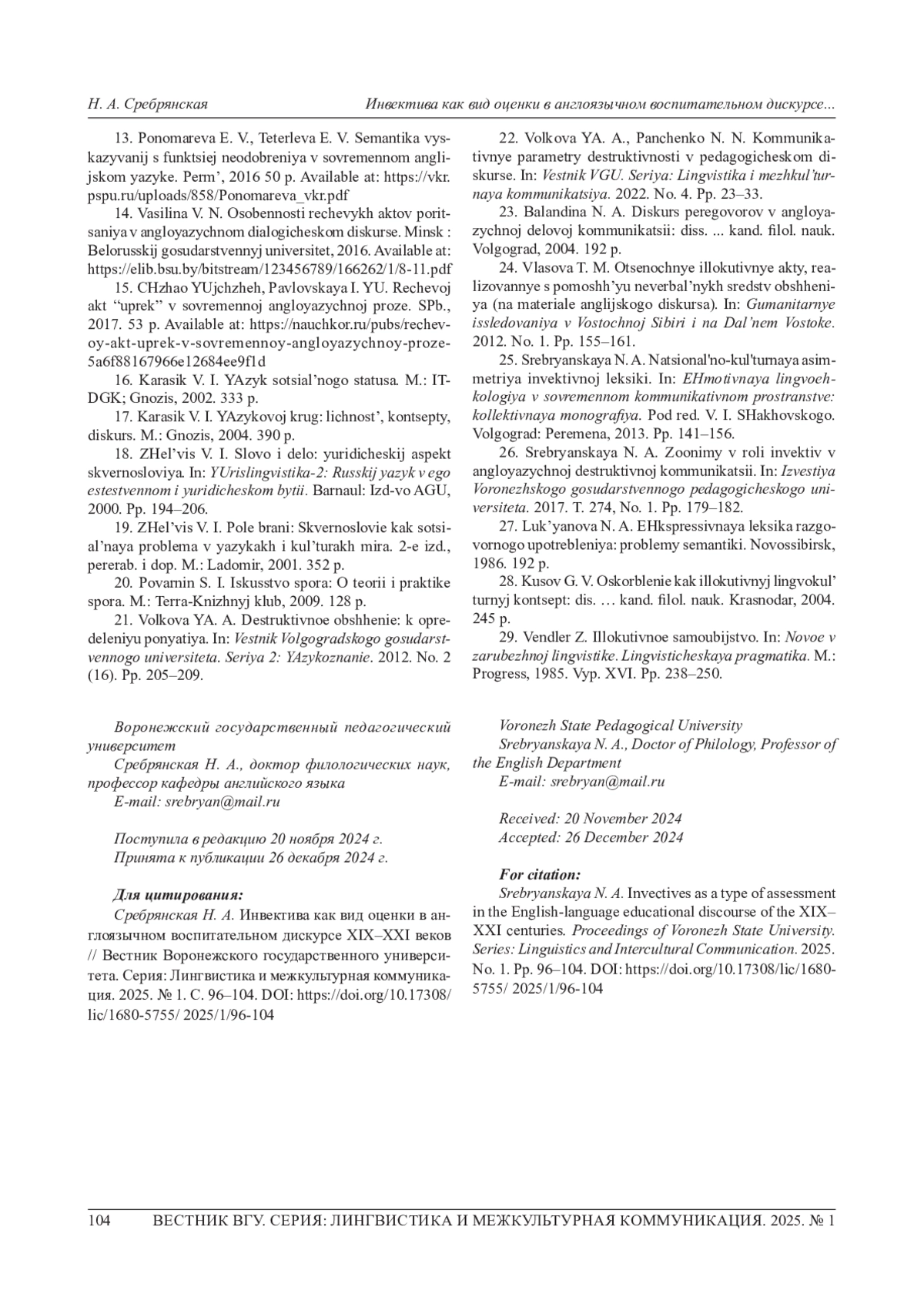 26. Сребрянская Н. А. Зоонимы в роли инвектив в англоязычной деструктивной коммуникации // Изв. Воронеж, гос. пед. ун-та. 2017. Т. 274, № 1. С. 179-182.