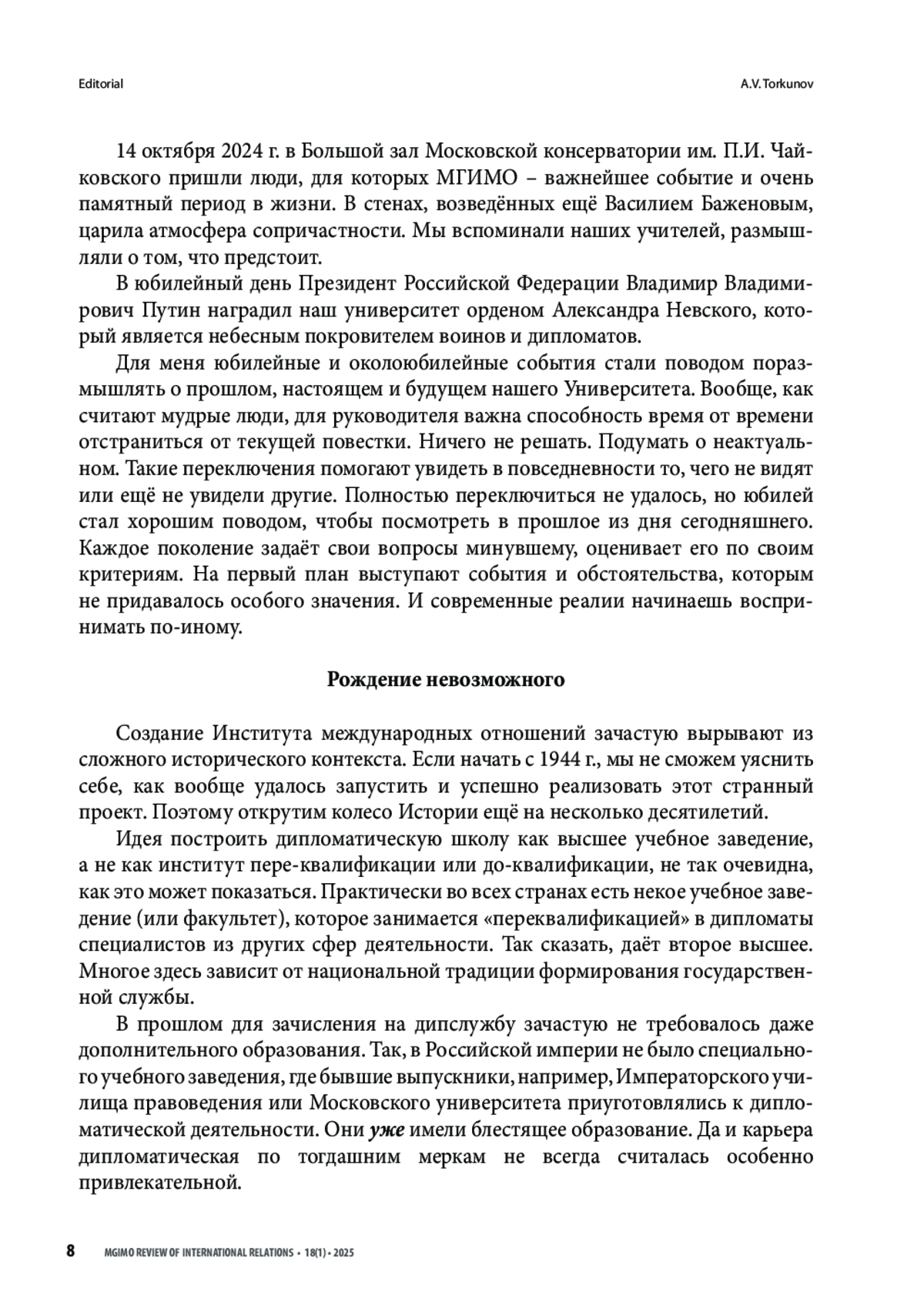 Статья посвящена анализу МГИМО как уникального феномена в сфере дипломатического образования и исследований международных отношений. Автор выявляет ключевые факторы, обусловившие особый статус вуза, начиная с исторических предпосылок его создания и заканчивая современными вызовами. Подчёркивается, что МГИМО, во многом опираясь на традиции Лазаревского института восточных языков, смог органично соединить в своём образовательном процессе фундаментальные гуманитарные дисциплины, интенсивное изучение иностранных языков и прикладные навыки, необходимые для практической дипломатии. Особое внимание уделяется институциональным механизмам, которые позволили университету не только выжить, но и развиться, несмотря на идеологические ограничения и политические кризисы. Анализируются факторы, формирующие академическую среду и интеллектуальный капитал МГИМО: системный подход в исследованиях, включение методов сравнительного анализа, а также комплексная подготовка специалистов, способных работать в различных форматах – от традиционных двусторонних переговоров до многосторонней дипломатии в условиях глобальной турбулентности. Отдельно рассматривается роль МГИМО в становлении отечественных школ международных исследований. Университет предстаёт как лаборатория, синтезирующая передовые научные подходы с практическими нуждами государства. Делается вывод, что благодаря институциональной гибкости, тесной связи с государственными структурами, широкой линейке научных школ и последовательному расширению международных контактов, МГИМО сохраняет роль национального лидера в сфере подготовки дипломатов и проведения международных исследований.