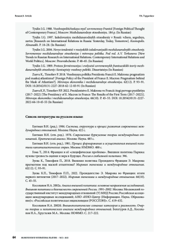 Статья представляет собой развёрнутый аналитический комментарий к основным концептам, идеям и научным построениям, выдвинутым И. Г. Тюлиным в его докторской диссертации, посвящённой исследованию процесса формирования и эволюции французских теорий международных отношений и концепций внешней политики по состоянию на конец 1980-х годов. Основной исследовательский вопрос: сохраняют ли свою значимость обсуждаемые в ней проблемы и аргументы, касающиеся путей эволюции французской внешнеполитической мысли, в современных, фундаментально изменившихся условиях? Ответ на него потребовал использования текстологического и сравнительно-исторического методов. Структурно статья состоит из введения, трех разделов и заключения. В первом разделе, посвящённом методологии, особое внимание обращено на показанную в работе И. Г. Тюлина обусловленность внешнеполитической мысли Франции национальными культурными традициями, а также на её анализ как целостной системы идейно-теоретического производства. Во втором разделе рассматриваются место и роль теорий и концепций в структуре французской внешнеполитической мысли, институциональные механизмы её формирования и эволюции по состоянию, сложившемуся на конец 1980-х годов. В третьем разделе даётся по необходимости краткий обзор изменений, которые произошли с тех пор в институциональной и теоретико-концептуальной сферах современной французской внешнеполитической мысли. Анализ этих изменений в свете тюлинских идей показывает, что в них находят своё проявление описанные в диссертации преемственность и тенденции идейно-теоретического производства в современной Франции. Присущие ей такие черты, как социологизм, стремление позиционировать собственную идентичность, этатизм, внутренняя противоречивость и преобладание политического реализма, сохраняются и в настоящее время. Однако они развиваются в новом, ультралиберальном контексте, который придаёт свою специфику содержанию теорий, концептуальных схем, общественно-политических дебатов и способов выражения их участниками своего мнения. В заключении делается вывод о том, что в диссертации И. Г. Тюлина убедительно показана сложная, полная оттенков и в то же время во многом единая картина внешнеполитической мысли Франции, без изучения особенностей формирования и эволюции которой трудно понять современные перипетии внешнеполитического курса этой страны.