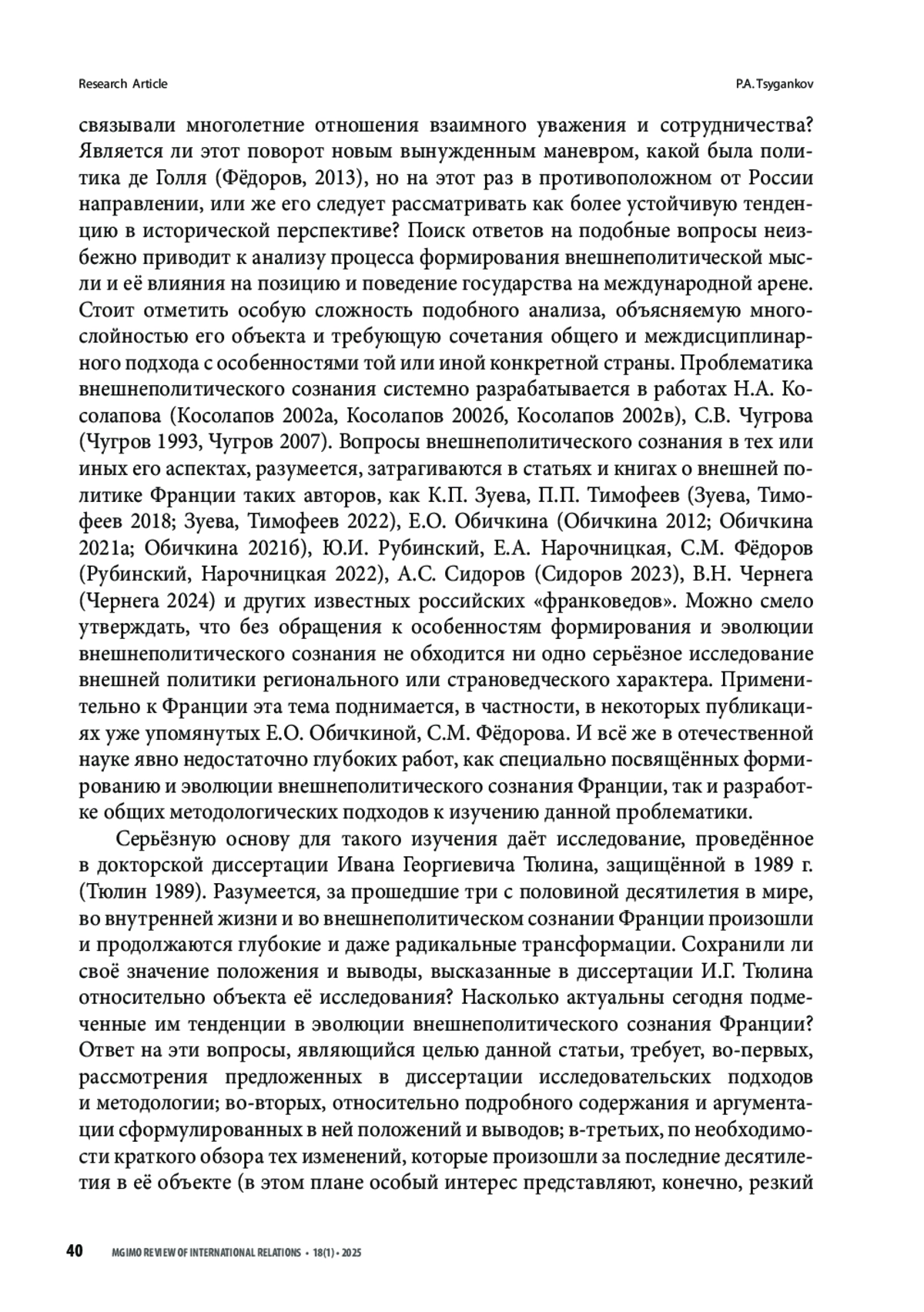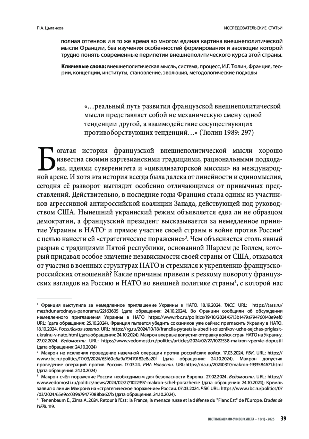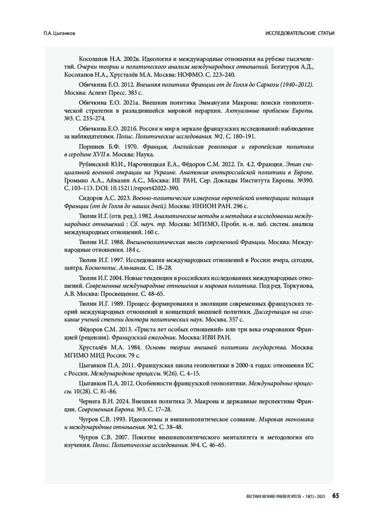 ЦЫГАНКОВ П. А. ВНЕШНЕПОЛИТИЧЕСКАЯ МЫСЛЬ КАК СИСТЕМА И ПРОЦЕСС: И. Г. ТЮЛИН О ФОРМИРОВАНИИ ИДЕЙНЫХ ОСНОВ ВНЕШНЕЙ ПОЛИТИКИ ФРАНЦИИ // ВЕСТНИК МГИМО-УНИВЕРСИТЕТА. 2025. ТОМ 18, № 1