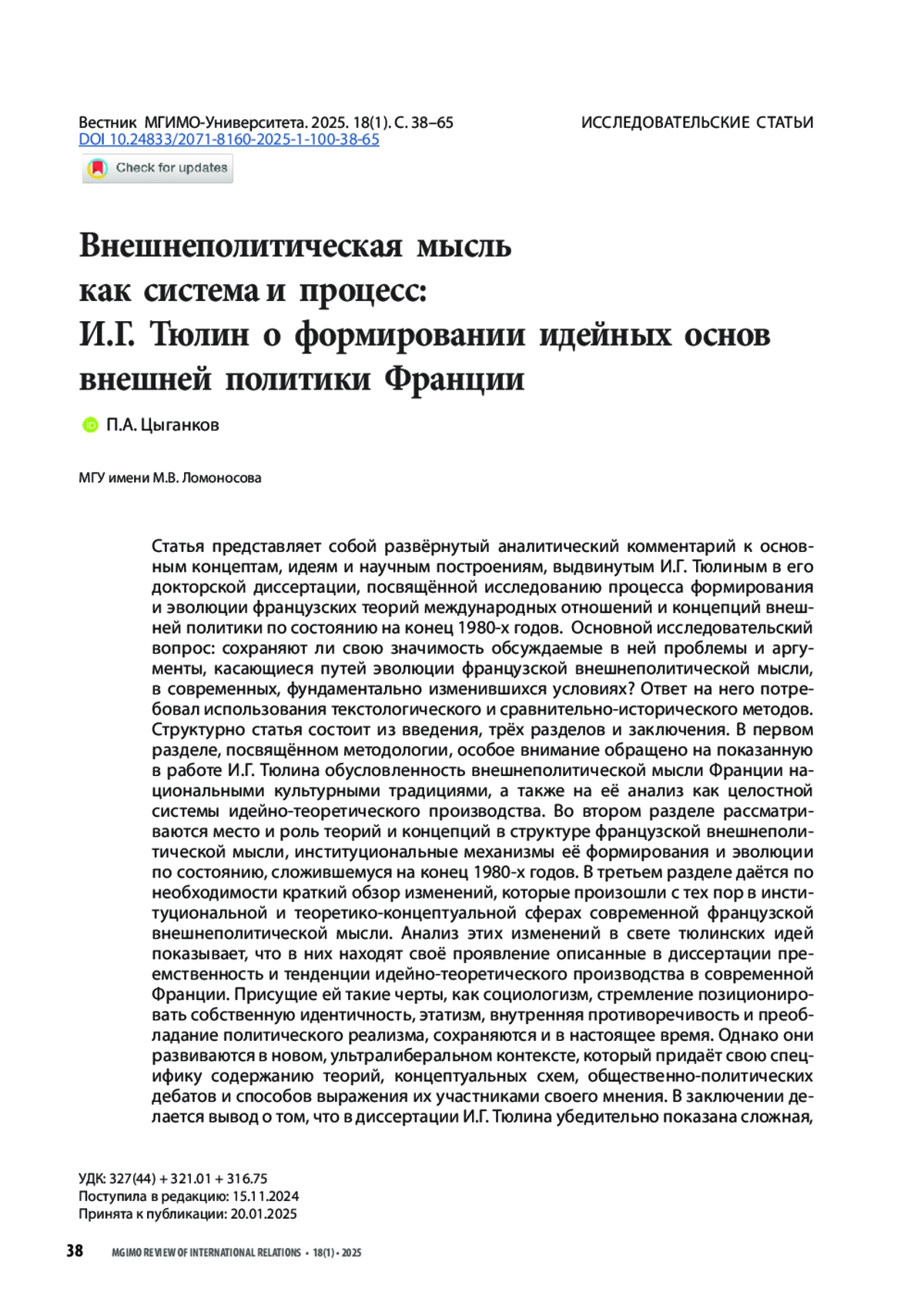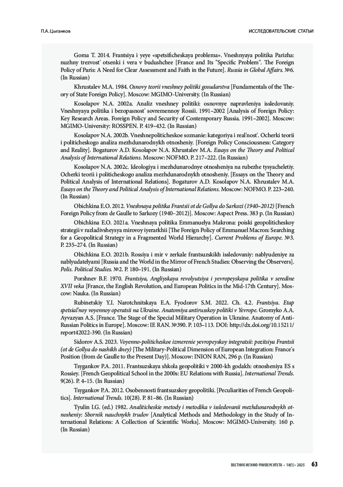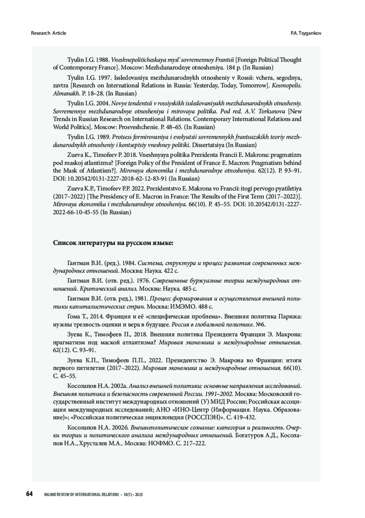 ЦЫГАНКОВ П. А. ВНЕШНЕПОЛИТИЧЕСКАЯ МЫСЛЬ КАК СИСТЕМА И ПРОЦЕСС: И. Г. ТЮЛИН О ФОРМИРОВАНИИ ИДЕЙНЫХ ОСНОВ ВНЕШНЕЙ ПОЛИТИКИ ФРАНЦИИ // ВЕСТНИК МГИМО-УНИВЕРСИТЕТА. 2025. ТОМ 18, № 1