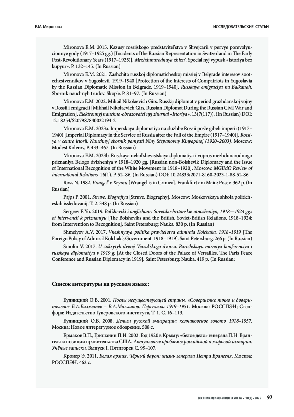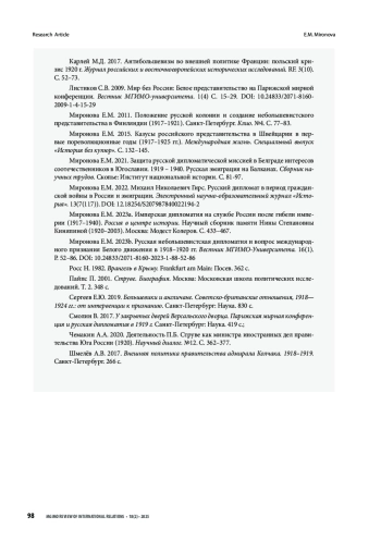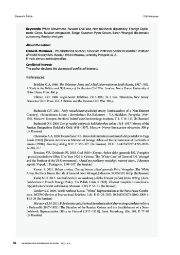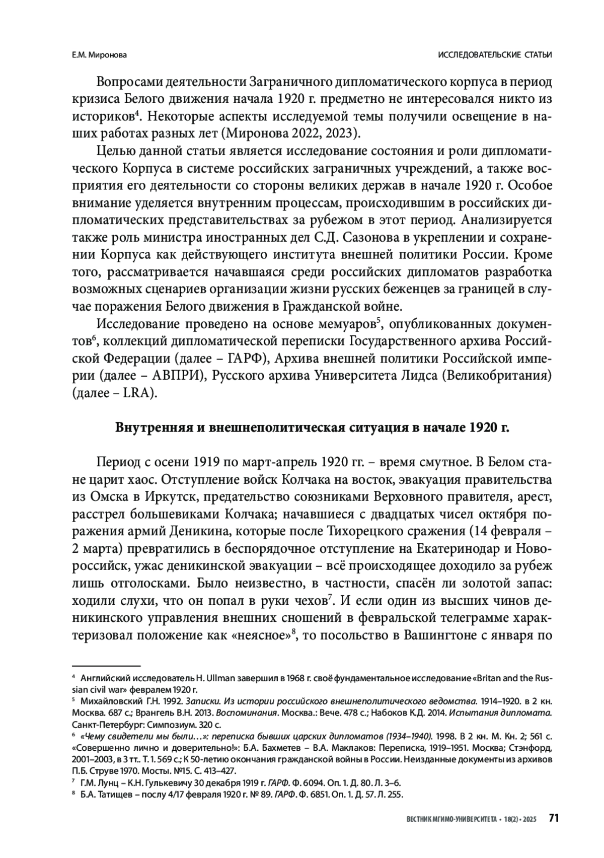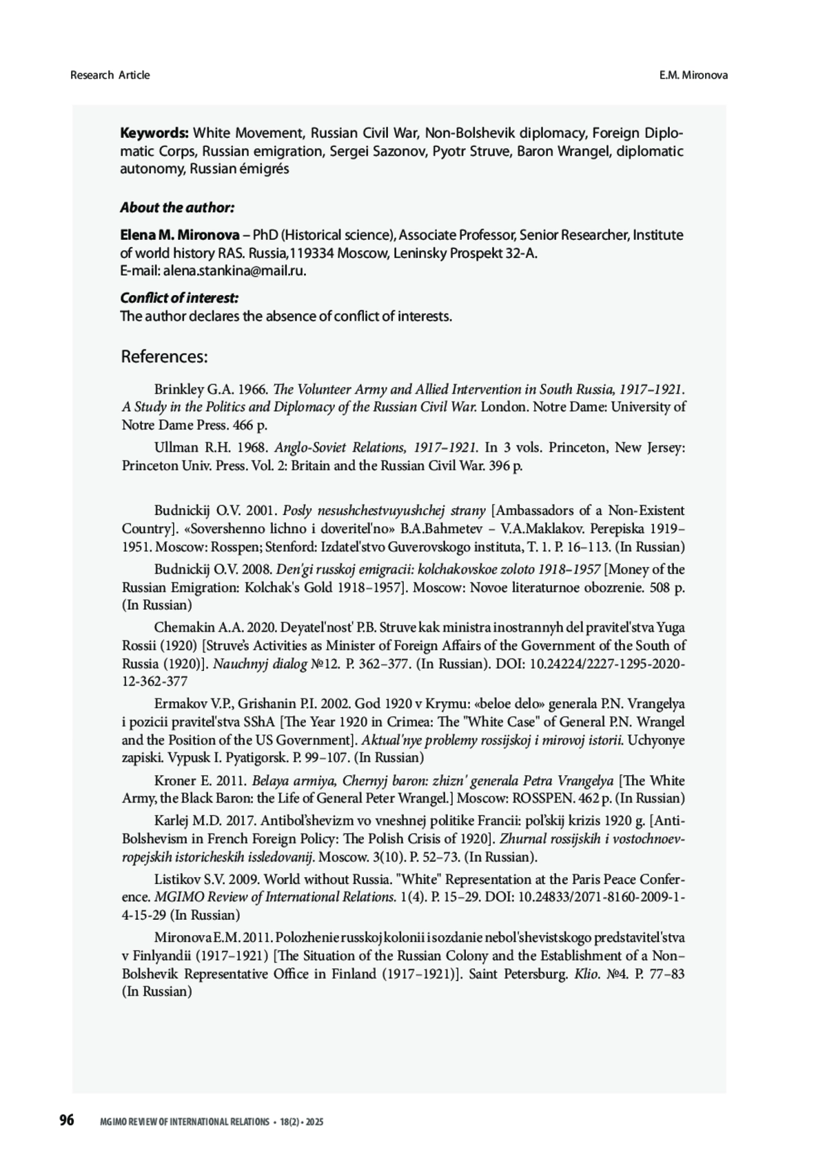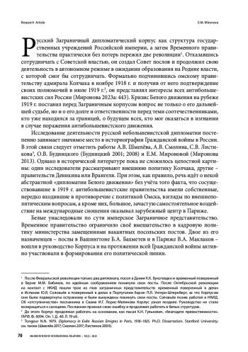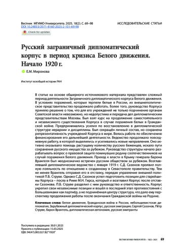 МИРОНОВА Е. М. РУССКИЙ ЗАГРАНИЧНЫЙ ДИПЛОМАТИЧЕСКИЙ КОРПУС В ПЕРИОД КРИЗИСА БЕЛОГО ДВИЖЕНИЯ. НАЧАЛО 1920 Г. // ВЕСТНИК МГИМО-УНИВЕРСИТЕТА. 2025. ТОМ 18, № 2