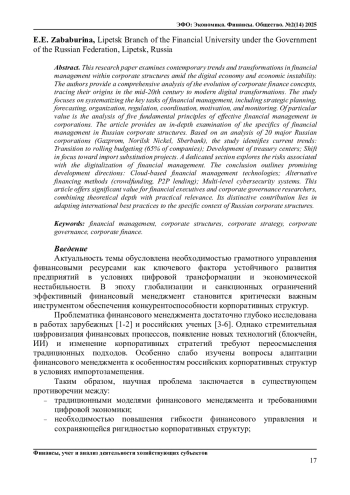 В данной научной статье исследуются современные тенденции по трансформации финансового менеджмента в корпоративных структурах в условиях цифровой экономики и экономической нестабильности. Авторы проводят комплексный анализ эволюции концепции корпоративных финансов, начиная от ее формирования в середине XX века до современных цифровых трансформаций. Основное внимание уделяется систематизации ключевых задач финансового менеджмента, включая стратегическое планирование, прогнозирование, организацию, регулирование, координацию, стимулирование и мониторинг. Особую ценность представляет анализ пяти фундаментальных принципов эффективного финансового управления в корпорациях. В статье подробно рассматривается специфика финансового менеджмента в российских корпоративных структурах. На основе анализа 20 крупнейших российских корпораций (Газпром, Норникель, Сбербанк) выявлены современные тенденции: переход на скользящее бюджетирование (65% компаний); развитие казначейских центров; смещение фокуса на импортозамещающие проекты. Отдельный раздел посвящен рискам цифровизации финансового менеджмента. В заключении обоснованы перспективные направления развития: облачные технологии финансового управления; альтернативные методы финансирования (краудфандинг, P2P-кредитование); многоуровневая система киберзащиты. Статья представляет значительную ценность для финансовых руководителей и исследователей корпоративного управления, сочетая теоретическую глубину с практической направленностью. Особый вклад работы заключается в адаптации международного опыта к специфике российских корпоративных структур.