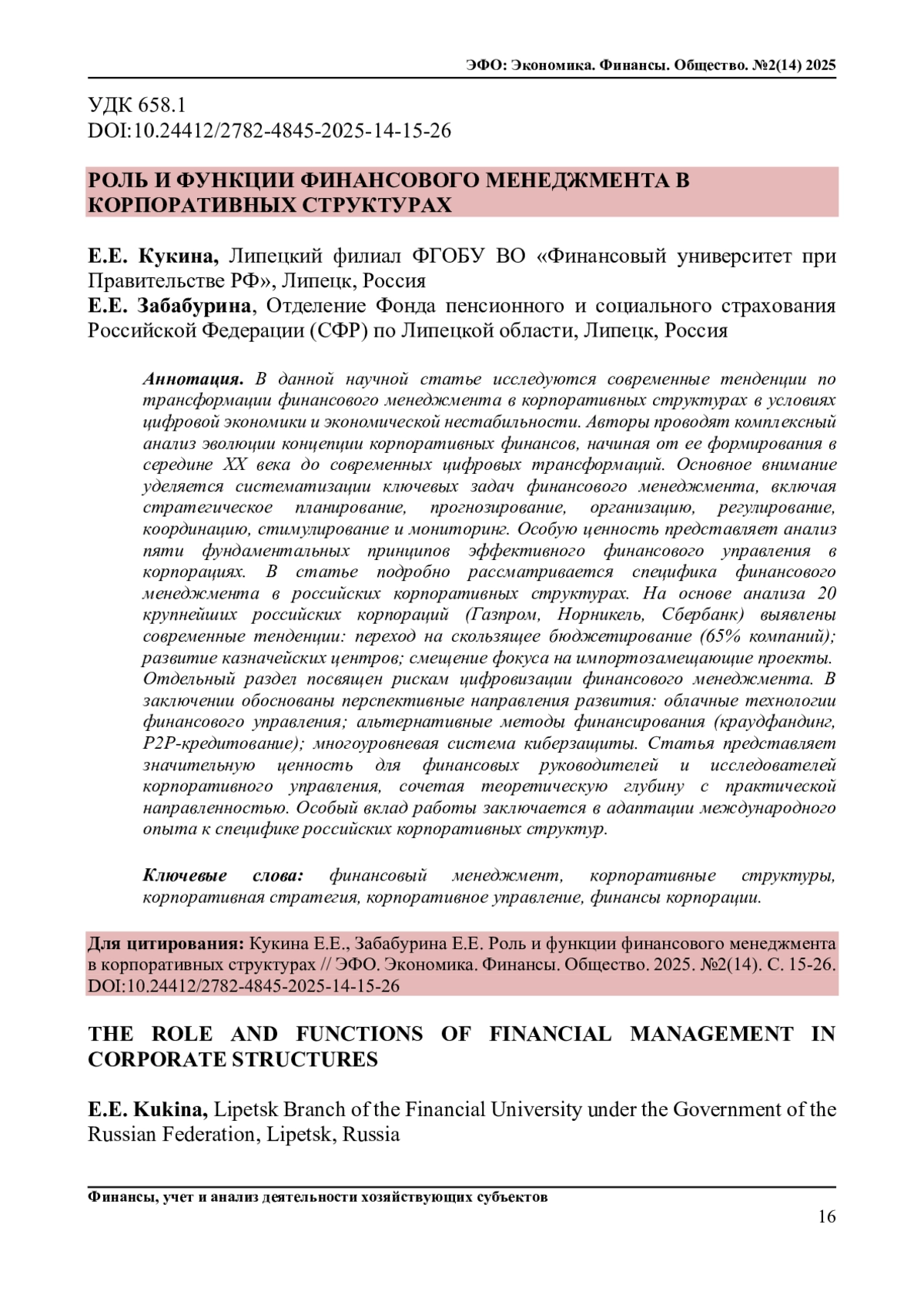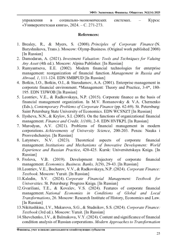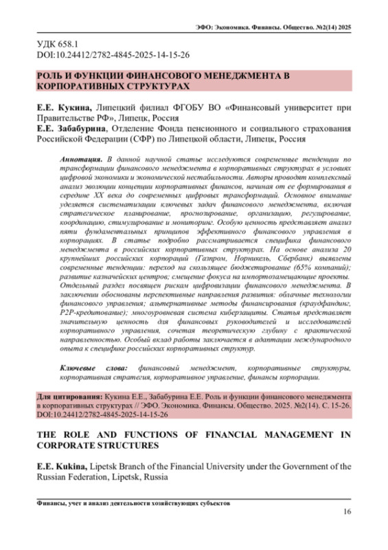 КУКИНА Е. Е., ЗАБАБУРИНА Е. Е. РОЛЬ И ФУНКЦИИ ФИНАНСОВОГО МЕНЕДЖМЕНТА В КОРПОРАТИВНЫХ СТРУКТУРАХ // ЭФО: ЭКОНОМИКА. ФИНАНСЫ. ОБЩЕСТВО. 2025. № 2 (14)