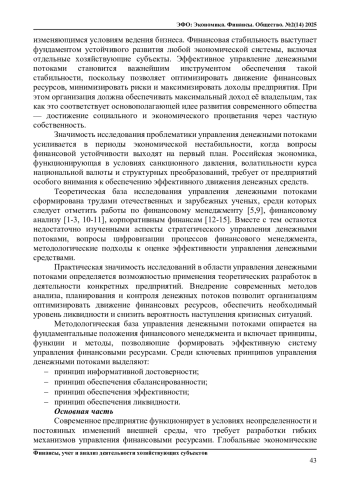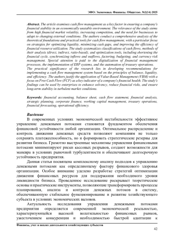 В статье рассматривается система управления денежными потоками как ключевого фактора обеспечения финансовой устойчивости предприятия в условиях экономической нестабильности. Актуальность исследования обусловлена высокой волатильностью финансовых рынков, усилением конкуренции и необходимостью адаптации бизнеса к изменяющимся внешним условиям. Авторы проводят комплексный анализ теоретических основ и практических инструментов управления денежными потоками, уделяя особое внимание стратегиям оптимизации ликвидности, минимизации кассовых разрывов и повышения эффективности использования финансовых ресурсов. В работе систематизированы классификации денежных потоков, методы их анализа (прямой, косвенный, коэффициентный) и инструменты оптимизации, включая сокращение финансового цикла, синхронизацию поступлений и выплат, факторинг, бюджетирование и управление валютными рисками. Особое внимание уделено цифровизации процессов финансового менеджмента, внедрению ERP-систем и автоматизации казначейских операций.