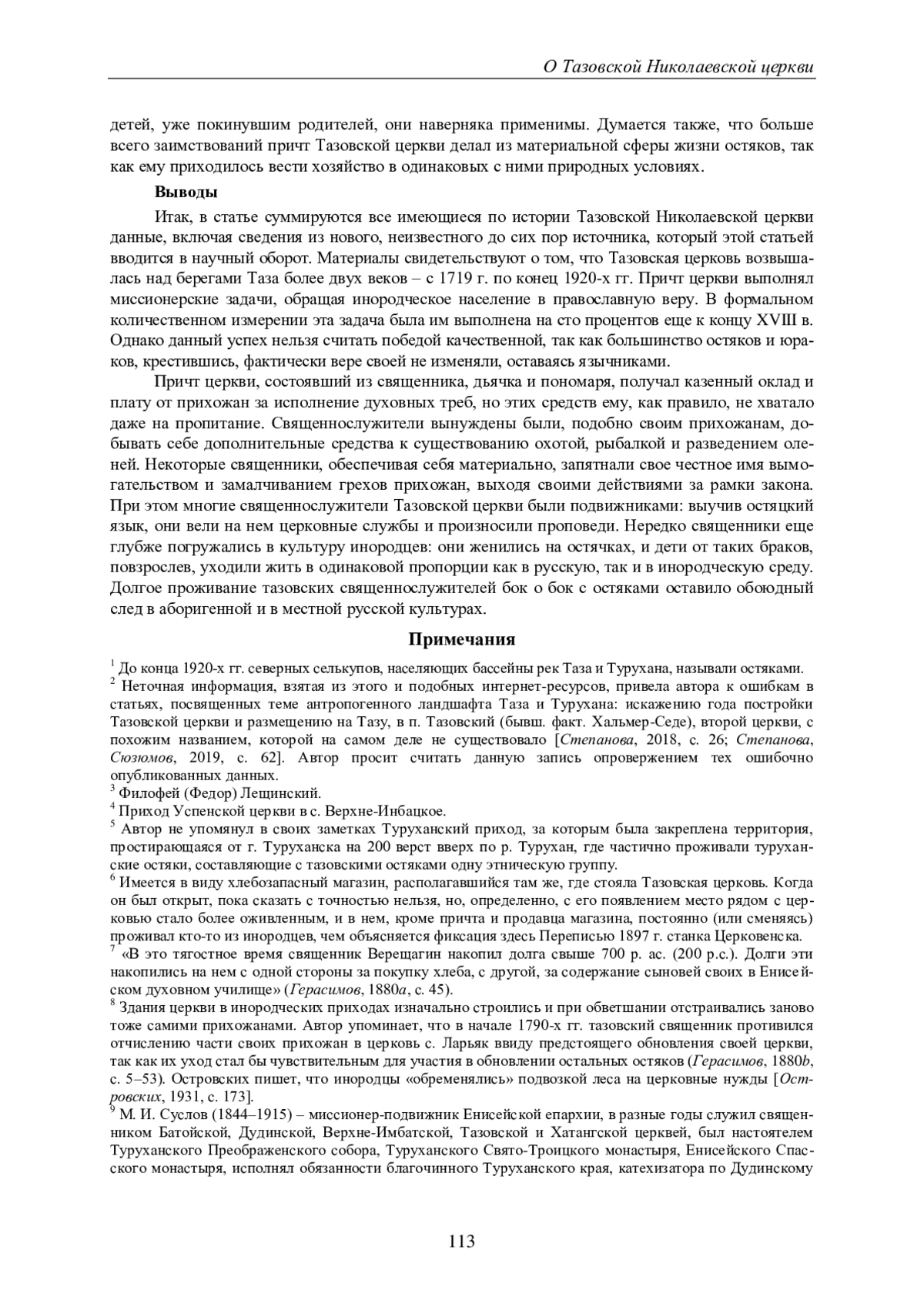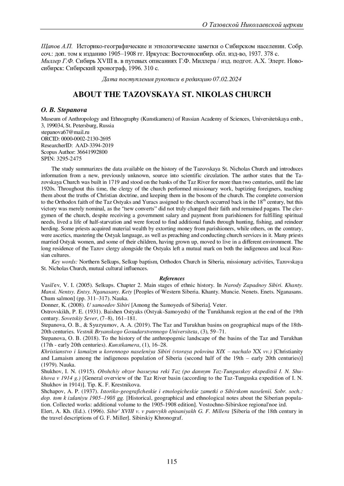 СТЕПАНОВА О. Б. О ТАЗОВСКОЙ НИКОЛАЕВСКОЙ ЦЕРКВИ // ВЕСТНИК ПЕРМСКОГО УНИВЕРСИТЕТА. ИСТОРИЯ. 2025. № 1 (68)