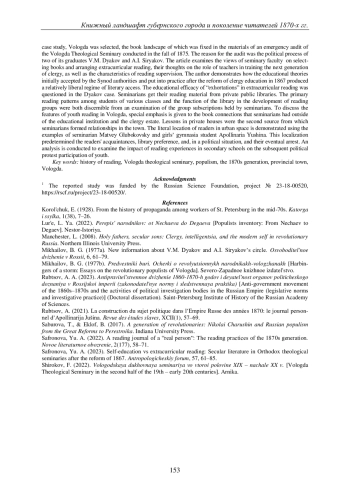 Статья посвящена анализу читательских практик поколения народников 1870-х гг. Смещая фокус внимания с кружков и организаций, сформировавшихся в университетских городах, автор обращается к опыту чтения учеников средних учебных заведений губернского города, определившему их стремление к самообразованию и отъезд из дома. В качестве кейса выбрана Вологда, книжный ландшафт которой подробно описан в материалах экстренной ревизии Вологодской духовной семинарии, проведенной чиновником Учебного комитета Синода осенью 1875 г. в связи с политическим процессом ее выпускников В. М. Дьякова и А. И. Сирякова. В статье анализируются идеи преподавателей семинарии об организации внеклассного чтения и выборе книг, представления о роли педагога в воспитании нового поколения священнослужителей, а также особенности надзора за чтением. Автор показывает, что относительно свободный режим доступа к литературе, первоначально одобряемый чиновниками Синода, был результатом педагогических идей, реализуемых после реформы духовного образования 1867 г. Дело Дьякова поставило под вопрос педагогическую ценность «увещеваний» в постановке внеклассного чтения. Источником литературы для семинаристов служили частные публичные библиотеки. Анализ групповых абонементов семинаристов позволил выявить как основные тенденции чтения учеников разных классов, так и роль библиотеки в формировании групп читателей. Особое внимание уделено книжным связям семинаристов за рамками учебного заведения и духовного сословия, позволяющим говорить об особенностях молодежного чтения в Вологде. Вторым источником формирования светских связей семинаристов были уроки в частных домах. На примере семинариста Матвея Глубоковского и гимназистки Аполлинарии Юшиной показана буквальная локализация читателей в городском пространстве, предопределившая их знакомство, выбор библиотеки и в конце концов арест по одному политическому делу. В заключении делается вывод о влиянии опыта чтения учащихся средних учебных заведений на их дальнейшее вовлечение в политический протест.
