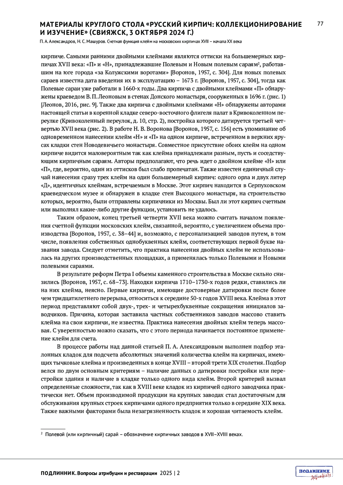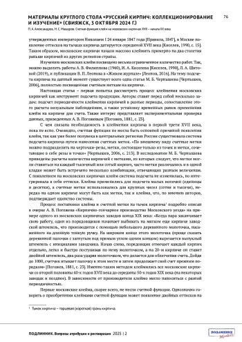 Процесс подсчета готовой продукции путем постановки на кирпичи клейм и счетных меток на московских кирпичных заводах второй половины XIX века подробно описан в очерке «Кирпично-гончарное производство Московского уезда» А. В. Погожева, опубликованном в 1881 году. Из описания следует, что, в отличии от других регионов страны, где для подсчета применялась система постановки знаков в виде точек и резцов на кирпиче-сырце, в Москве применялись в том числе и клейма. В данном исследовании впервые приведены результаты прямых подсчетов периодичности клеймения кирпичей, произведенных с конца XVIII до начала XX века, что дает четкое представление о системе, действовавшей на московских заводах. Авторами сделаны выводы о временном интервале использования клейм для подсчета готовой продукции, и заводах, на которых данная практика была применена впервые. Экспериментальным способом частично подтверждены данные, приведенные в работе А. В. Погожева.
