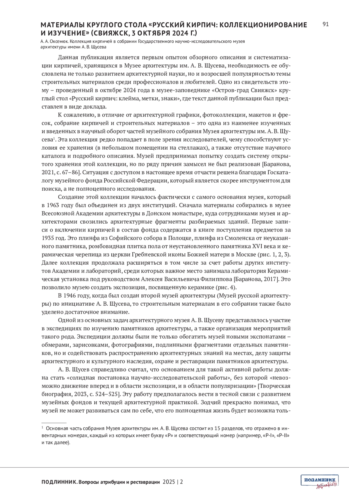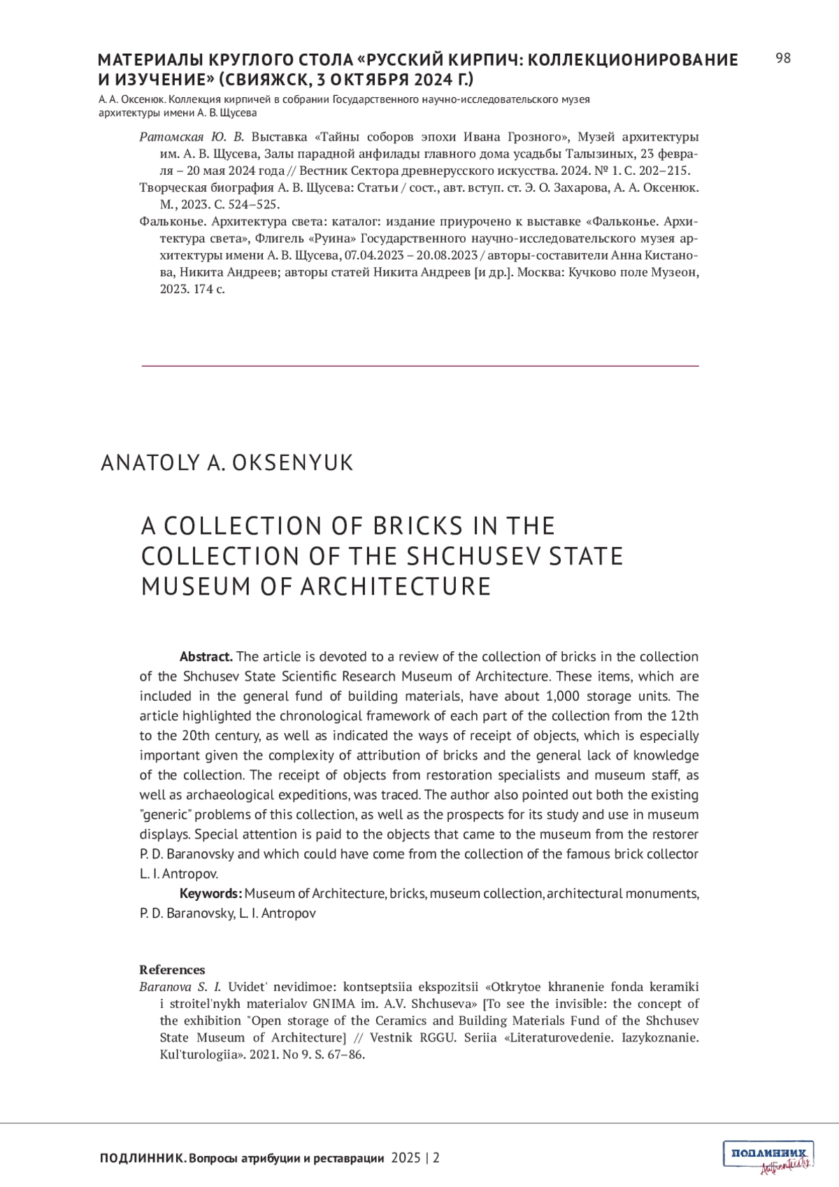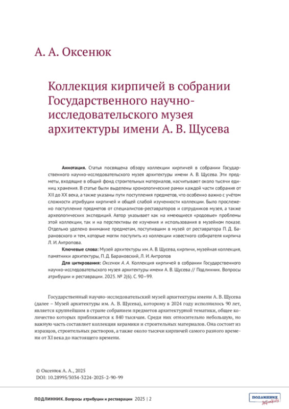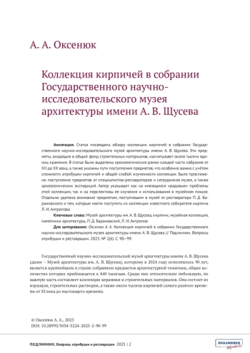 ОКСЕНЮК А.А. КОЛЛЕКЦИЯ КИРПИЧЕЙ В СОБРАНИИ ГОСУДАРСТВЕННОГО НАУЧНОИССЛЕДОВАТЕЛЬСКОГО МУЗЕЯ АРХИТЕКТУРЫ ИМЕНИ А. В. ЩУСЕВА // ПОДЛИННИК. ВОПРОСЫ АТРИБУЦИИ И РЕСТАВРАЦИИ. 2025. № 2 (6)
