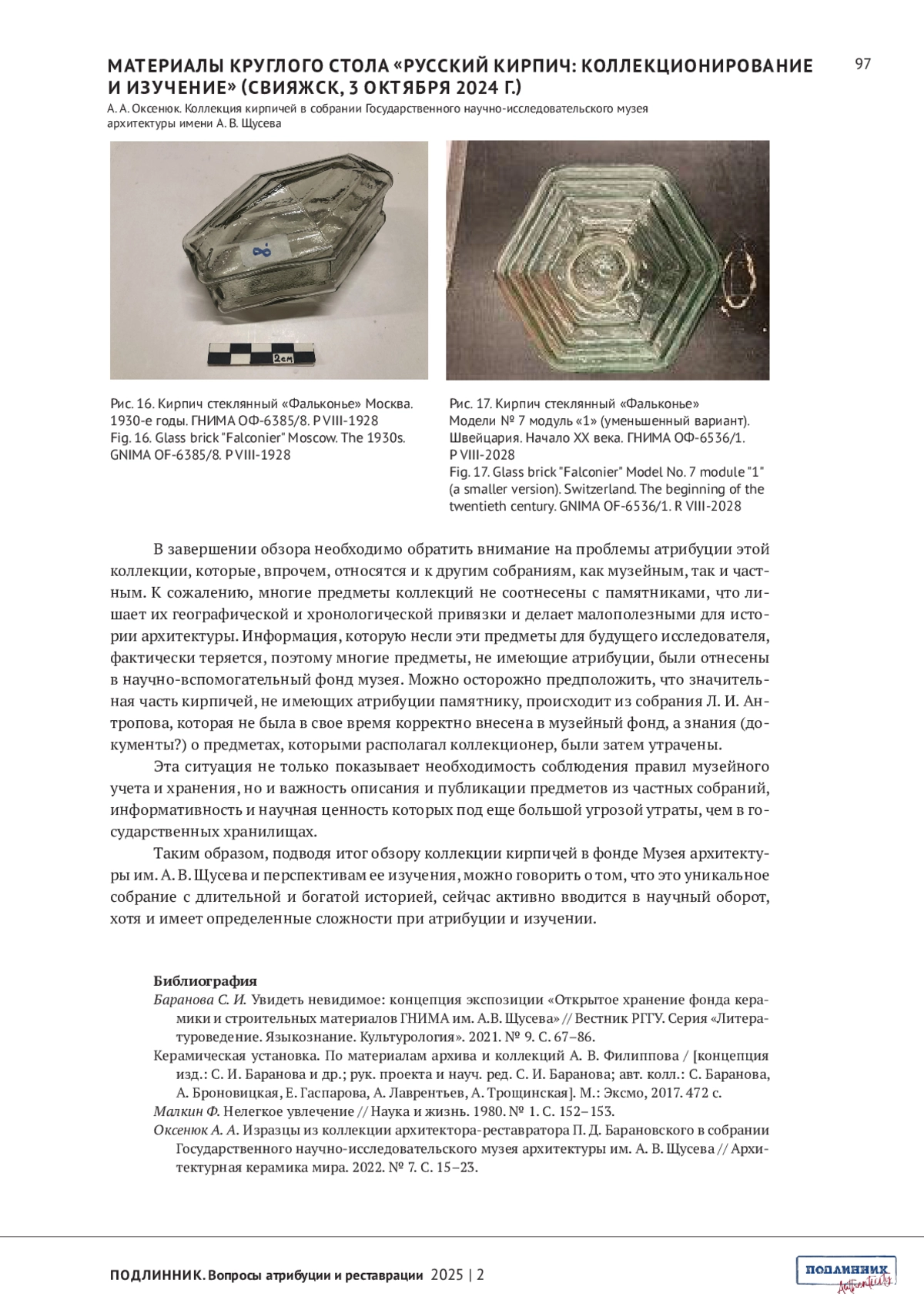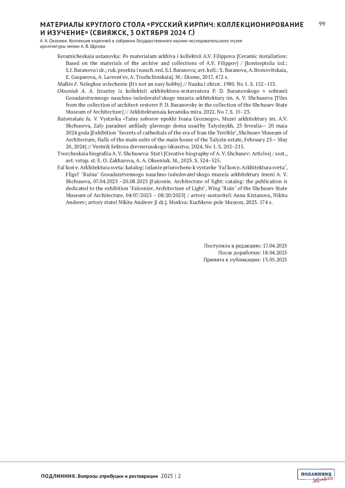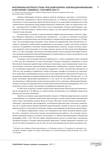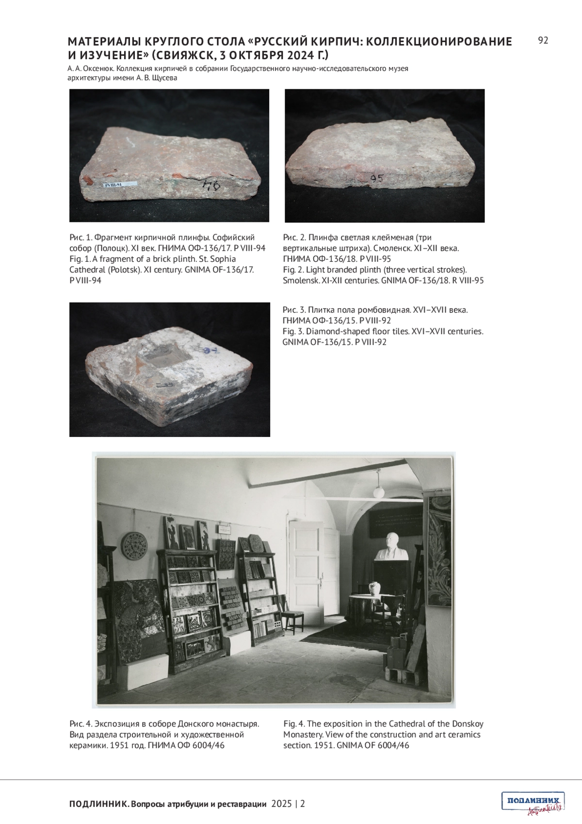 ОКСЕНЮК А.А. КОЛЛЕКЦИЯ КИРПИЧЕЙ В СОБРАНИИ ГОСУДАРСТВЕННОГО НАУЧНОИССЛЕДОВАТЕЛЬСКОГО МУЗЕЯ АРХИТЕКТУРЫ ИМЕНИ А. В. ЩУСЕВА // ПОДЛИННИК. ВОПРОСЫ АТРИБУЦИИ И РЕСТАВРАЦИИ. 2025. № 2 (6)