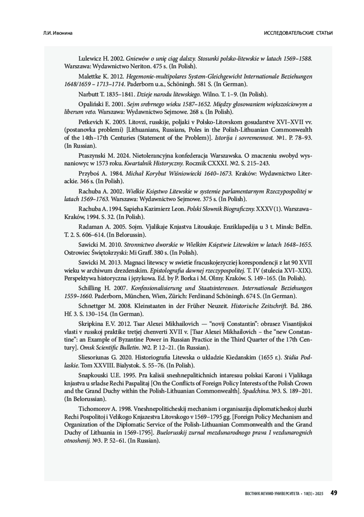 В статье исследуется взаимодействие политических элит Великого княжества Литовского (ВКЛ) и Королевства Польского в контексте формирования Вестфальской системы международных отношений в XVII веке. На основе системного подхода, концепции композитарного государства и теории конфессионализации анализируется влияние международной среды на политическую динамику между литовской и польской элитами. С момента подписания Люблинской унии 1569 г. элиты ВКЛ стремились закрепить равноправие с польской стороной и последовательно защищали свои интересы во всех политических вопросах, включая внешнюю политику. Особенно интенсивным это взаимодействие стало в XVII веке, что во многом было связано с масштабными политическими и конфессиональными изменениями в Европе, достигшими кульминации в период Тридцатилетней войны (1618–1648 гг.) и получившими юридическое оформление в Вестфальском мире 1648 года. Исследование показывает, что, несмотря на периодически возникавшие разногласия между элитами Польши и ВКЛ, они не рассматривали друг друга как противников. Напротив, их объединяло конституционное устройство, формировавшаяся вследствие полонизации общая культурная идентичность и необходимость поддержания авторитета Речи Посполитой в новой Вестфальской системе европейских государств. Автор приходит к выводу, что формирование Вестфальской системы международных отношений оказало заметное влияние на взаимодействие элит Великого княжества Литовского и Королевства Польского. Международная среда этого периода способствовала скорее интеграции, нежели дезинтеграции обоих составных частей Речи Посполитой. Несмотря на частые изменения конфессионально-политических союзов и внутренние разногласия, общие внешнеполитические вызовы, связанные с окружением Польско-Литовского государства сильными конкурентами, такими как Московское государство и Швеция, вынуждали элиты обеих частей стремиться к согласованию интересов и укреплению единства. Таким образом, международные процессы середины XVII века выступали в качестве важного внешнего фактора, определявшего характер политического взаимодействия польской и литовской элит и способствовавшего усилению внутренней консолидации Речи Посполитой в новых реалиях Вестфальского порядка.
