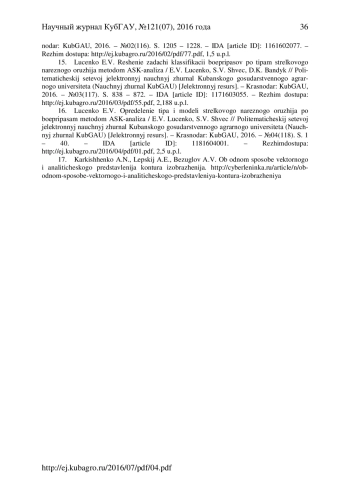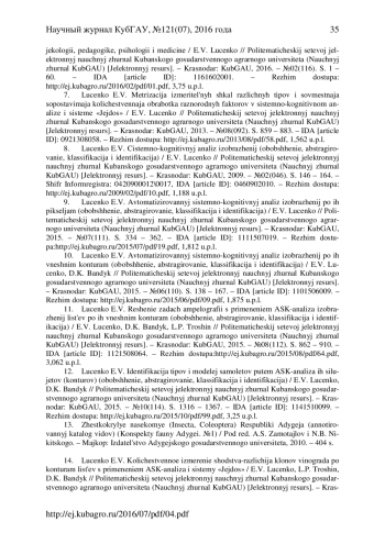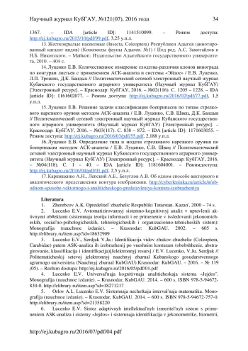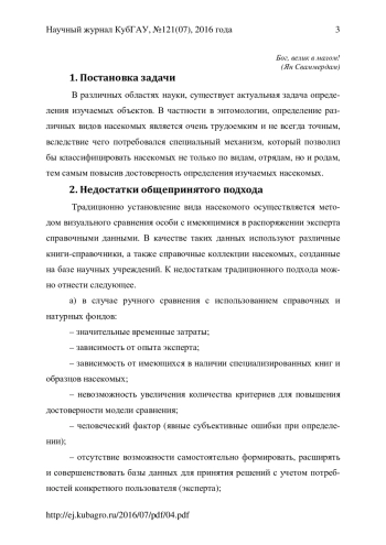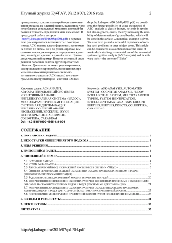 Из огромного количества организмов, населяющих нашу планету, насекомые составляют 70%, являясь самым многочисленным из беспозвоночных животных классов, насчитывающих более 2 млн. видов. Сложно отыскать такое место, где нельзя было бы встретить представителей этого огромного класса. Они полностью освоили все среды обитания - воду, сушу, воздух. Для них характерны сложные инстинкты, всеядность, высокая плодовитость, для некоторых - общественный образ жизни. Насекомых можно встретить на огромных высотах, доходящих до уровня 5000 метров, населяют они и безжизненные пустыни, где практически никогда не бывает дождей, не говоря уж об отсутствии какой - либо растительности. Глубокие пещеры, в которых нет ни солнечного света, ни условий для питания и существования живых организмов - это тоже места обитания насекомых, встретить их можно далеко за Полярным кругом, и даже - на многих островах Антарктики, где кроме безжизненных скал, казалось бы, нет ничего. Среди насекомых, одним из самых больших и многочисленных семейств - являются жужелицы (Carabidae). Они тонко реагируют на изменения почвенно-растительных, гидротермических и микроклиматических условий среды, что делает их удобным модельным объектом различных экологических и зоологических исследований. Жужелицам принадлежит большое число родов и видов, нередко трудно различимых, в связи с этим для диагностики используются много различных признаков: принимаются во внимание окраска, форма тела, наружное строение, структура поверхности, размеры, строение гениталий и хетотаксия. Вследствие того, что количество жужелиц огромно, а по внешнему виду очень трудно определить их родовую принадлежность, возникла потребность автоматизации процесса их идентификации, вследствие чего потребовался специальный механизм, который бы повысил точность определения этих насекомых. В предыдущей работе авторов (http://ej. kubagro. ru/2016/05/pdf/01. pdf) в перспективе рассматривалась возможность с помощью метода АСК-анализа классифицировать насекомых не только по видам, но и по родам, отрядам, тем самым повысив достоверность определения жужелиц, что и будет сделано в данной статье. Приводится численный пример. Имеется успешный опыт решения подобных задач в других предметных областях. Данная статья может рассматриваться, как продолжение серии работ, посвященных применению автоматизированного системно-когнитивного анализа (АСК-анализ) и его программного инструментария - системы «Эйдос».