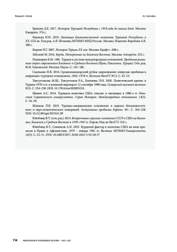 33. Товсултанова М.Ш., Товсултанов Р.А., Галимова Л.Н. 2020. Политический кризис в Турции 1970-х гг. и военный переворот 12 сентября 1980 года. Самарский научный вестник. Т. 9, № 3. C. 234-238. https://doi.org/10.17816/snv202093210.