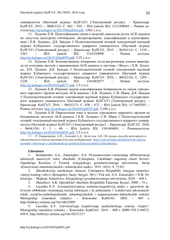 Насекомые являются важнейшим компонентом естественных биоценозов и агроценозов. Одним из самых больших и многочисленных семейств - являются жужелицы (Carabidae), насчитывающие по разным данным более 30000 видов. Для жужелиц характерны различные способы питания, местообитания, занимаемые яруса, сезонная и суточная активность. Они обитают как на поверхности, так и в почве, реже на кустарниках и деревьях. Виды семейства жужелицы - активные жуки с длинными тонкими антеннами равномерной толщины, длинными надкрыльями и длинными ногами, приспособленными к беганию. Размеры их варьируют от нескольких миллиметров до 10 см. Являясь активными хищниками, жужелицы играют огромное практическое значение, уничтожая вредителей еще до достижения последними порога вредоносности, тем самым обеспечивая их естественную регуляцию. Исходя из того, что количество жужелиц велико, а размеры их иногда составляют всего несколько миллиметров, возникла проблема определения вида этих насекомых (или их идентификации), вследствие чего потребовался специальный инструмент, который, с одной стороны, упростил бы получение данных об этих насекомых, а с другой стороны, повысил бы их точность. В данной статье предлагается новый для данной предметной области подход к идентификации различных видов жужелиц по их внешнему контуру с применением программного инструментария автоматизированного системно-когнитивного анализа (АСК-анализ) - универсальной когнитивной аналитической системы «Эйдос», которая прекрасно себя зарекомендовала при изучении других объектов. Причина, по которой было решено использовать эту систему, состоит в том, что обычные (стандартные) способы определения жужелиц, имеют определенные недостатки: человеческий фактор (явные ошибки при определении); достаточно большие временные затраты; невозможность увеличения количества критериев для повышения достоверности модели сравнения. Данная статья направлена на преодоление этих недостатков, путем использования универсальной когнитивной аналитической системы «Эйдос», автоматизированного системно-когнитивного анализа (АСК-анализ). Приводится численный пример.