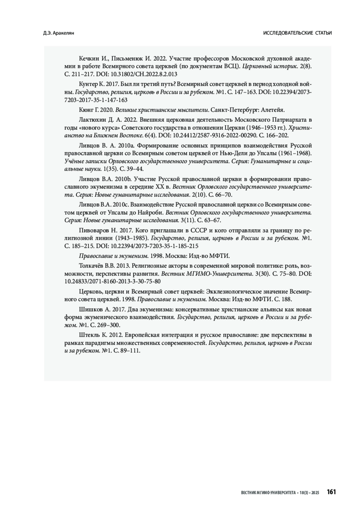 АРАКЕЛЯН Д. Э. РЕАКЦИЯ ВСЕМИРНОГО СОВЕТА ЦЕРКВЕЙ НА УКРАИНСКИЙ КРИЗИС (2022–2024 ГГ.) // ВЕСТНИК МГИМО-УНИВЕРСИТЕТА. 2025. ТОМ 18, № 3