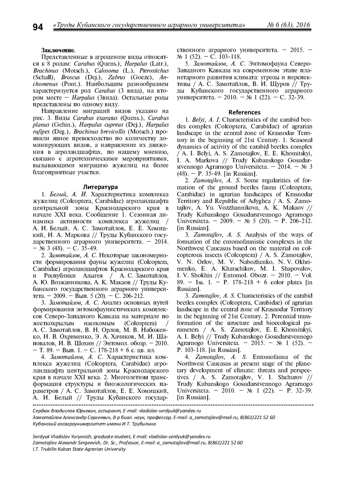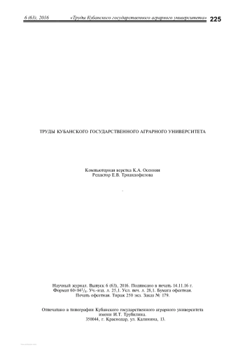 Приводятся данные по видовому составу жужелиц агроценозов ФГБНУ ВНИИБЗР в черте г. Краснодара. Исследовано 9 опытных участков, выявлено 12 преобладающих видов из 8 родов жужелиц. Основными критериями выбора агроценозов являлась пространственная близость участков, позволяющая проследить миграции жужелиц, разнообразие сельскохозяйственных культур и внесение в почву различных препаратов как химического, так и биологического происхождения. Описывается сезонная динамика активности карабидокомплекса. Проанализирован материал, собранный почвенными ловушками Барбера в 2016 году. Определено, что наибольшее видовое разнообразие отмечается в летний период. Преобладающими видами в весенний период являются Carabus exaratus, Carabus planus, Harpalus rufipes, Harpalus cupreus и Brachinus brevicollis, в летний период - Carabus planus, Carabus exaratus, Harpalus cupreus, Harpalus rufipes, Anchomenus dorsalis и Brachinus brevicollis, а в осенний период - Carabus planus, Carabus exaratus, Harpalus cupreus, Harpalus rufipes и Brachinus brevicollis. Для установления основного вектора перемещения жужелиц в агроландшафтах проведена обработка данных по динамике численности и обилию видов жужелиц. Установлены направления миграций массовых видов. Полученные данные имеют определенное значение для конкретизации представлений о фауне жужелиц агроценозов города Краснодара и могут быть использованы при составлении кадастров животного мира этого муниципального образования.