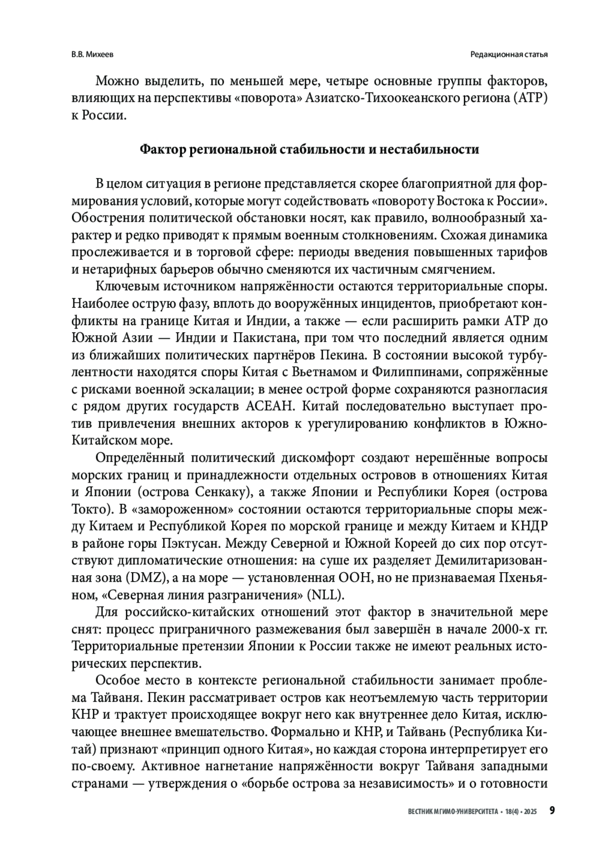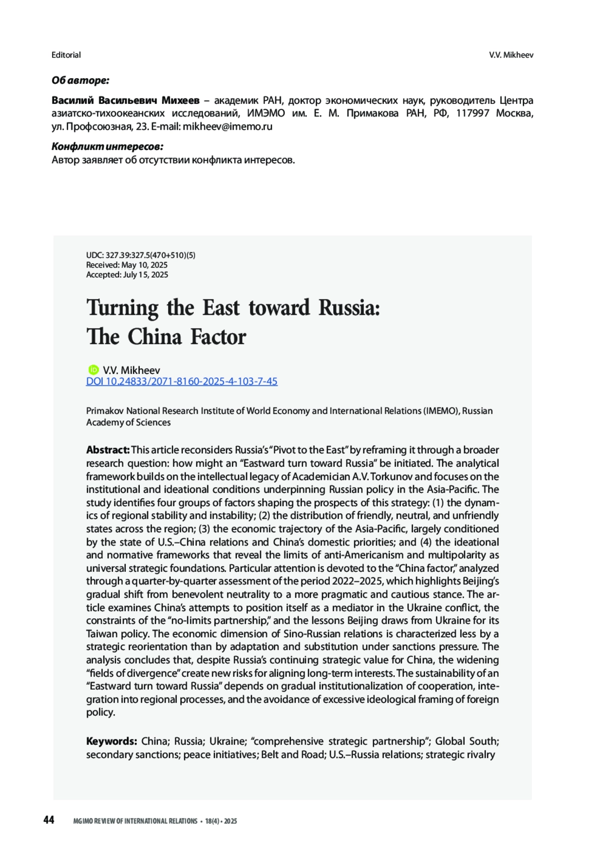 Статья посвящена переосмыслению концепции «поворота России на Восток» через постановку более широкого исследовательского вопроса — каким образом возможно инициировать «поворот Востока к России». Теоретическая основа анализа восходит к научному наследию академика А. В. Торкунова и акцентирует внимание на институциональных и идейных условиях реализации российской политики в Азиатско-Тихоокеанском регионе (АТР). Автор выделяет четыре группы факторов, определяющих перспективы этой стратегии: (1) характер региональной стабильности и нестабильности; (2) степень дружественности или недружественности стран региона; (3) особенности экономической динамики АТР, во многом зависящей от состояния китайско-американских отношений и внутренних приоритетов КНР; (4) идейно-ценностные рамки, показывающие ограниченность антиамериканизма и многополярности в качестве универсальных стратегических оснований. Центральное место в анализе занимает «фактор Китая», рассмотренный на основе поквартальной динамики 2022–2025 гг., что позволяет выявить постепенный переход позиции Пекина от доброжелательного нейтралитета к более прагматичной и осторожной линии поведения. Рассматриваются попытки Китая утвердиться в роли посредника в украинском конфликте, пределы концепции «партнёрства без границ», уроки, которые Пекин извлекает из украинского опыта для своей политики в отношении Тайваня. Экономическое измерение двусторонних связей характеризуется не столько стратегическим разворотом, сколько адаптацией и замещением, обусловленными санкционными ограничениями. Делается вывод о том, что при всей сохраняющейся стратегической значимости России для Китая расширение «полей расхождений» формирует новые риски для согласования интересов. Устойчивость «поворота Востока к России» возможна лишь при опоре на постепенную институционализацию сотрудничества, включение в региональные процессы и отказ от излишней идеологизации внешнеполитического курса.