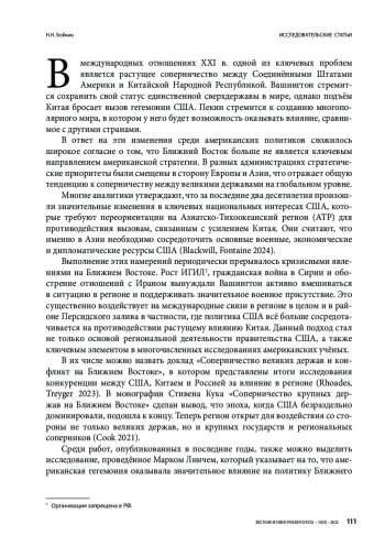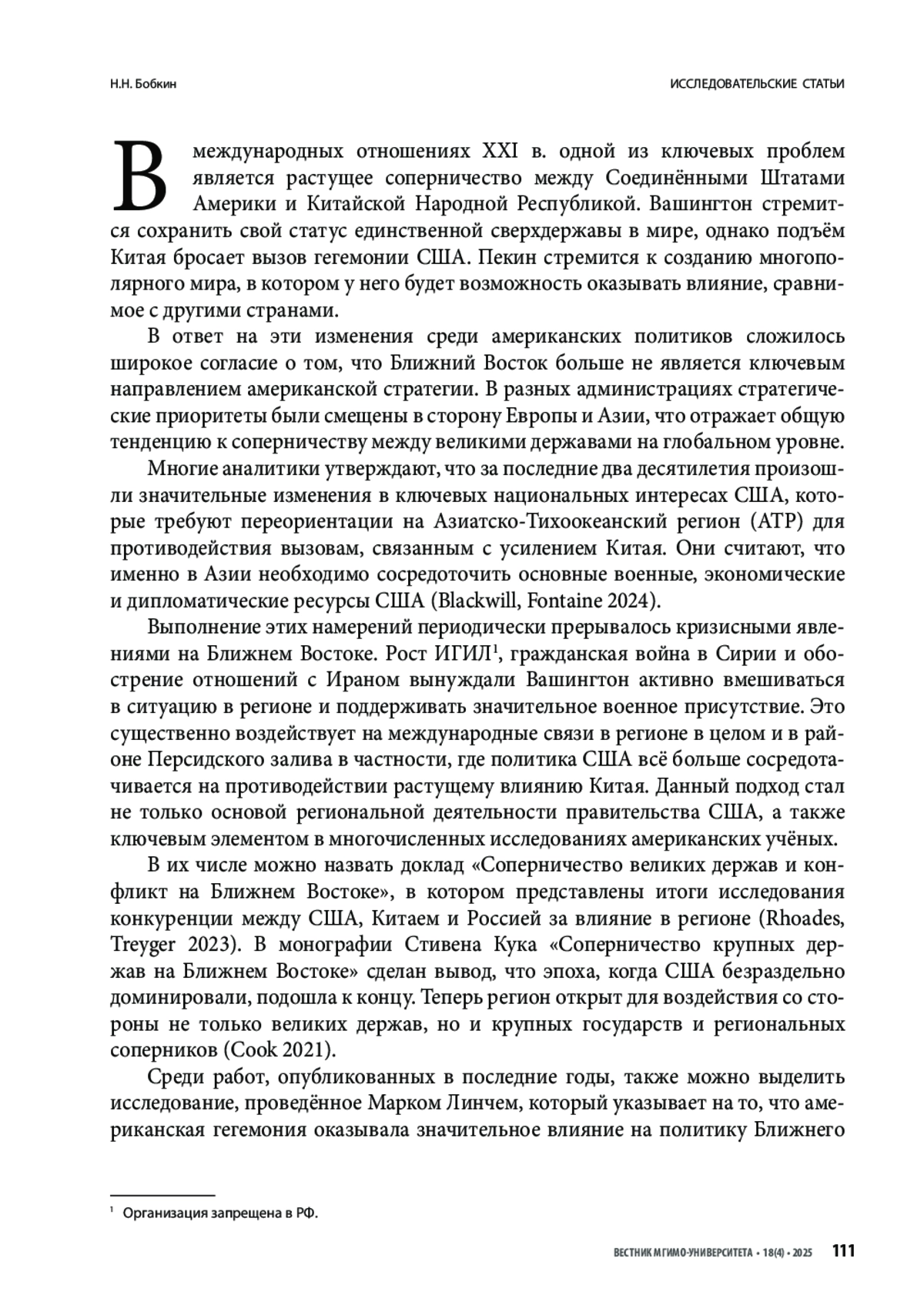 19. Бобкин Н.Н. 2024. Соперничество между США и Китаем на Ближнем Востоке: последствия для региональной и глобальной политики. США и Канада: экономика, политика, культура. 1(649). С. 18-34. https://doi.org/10.31857/S2686673024010021.