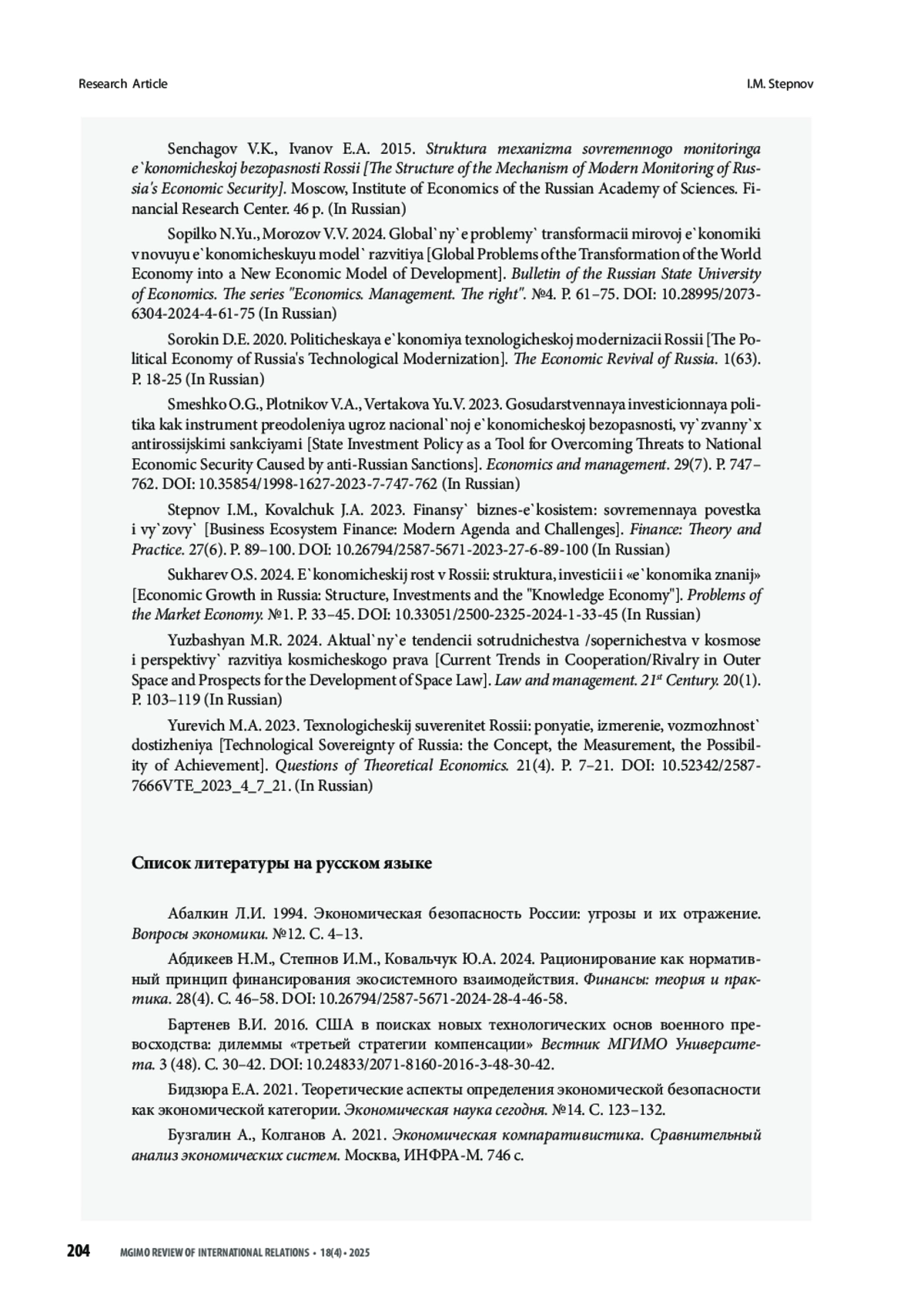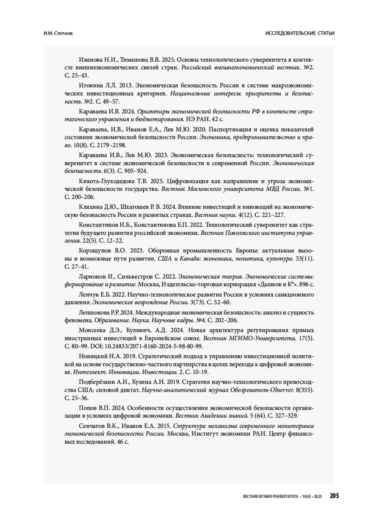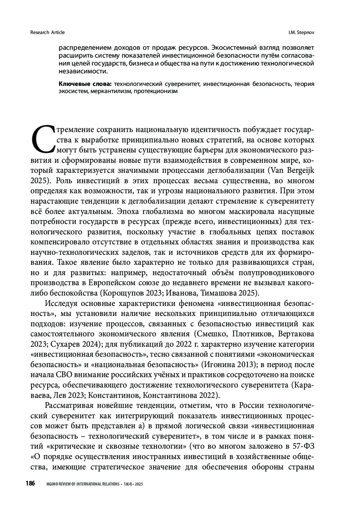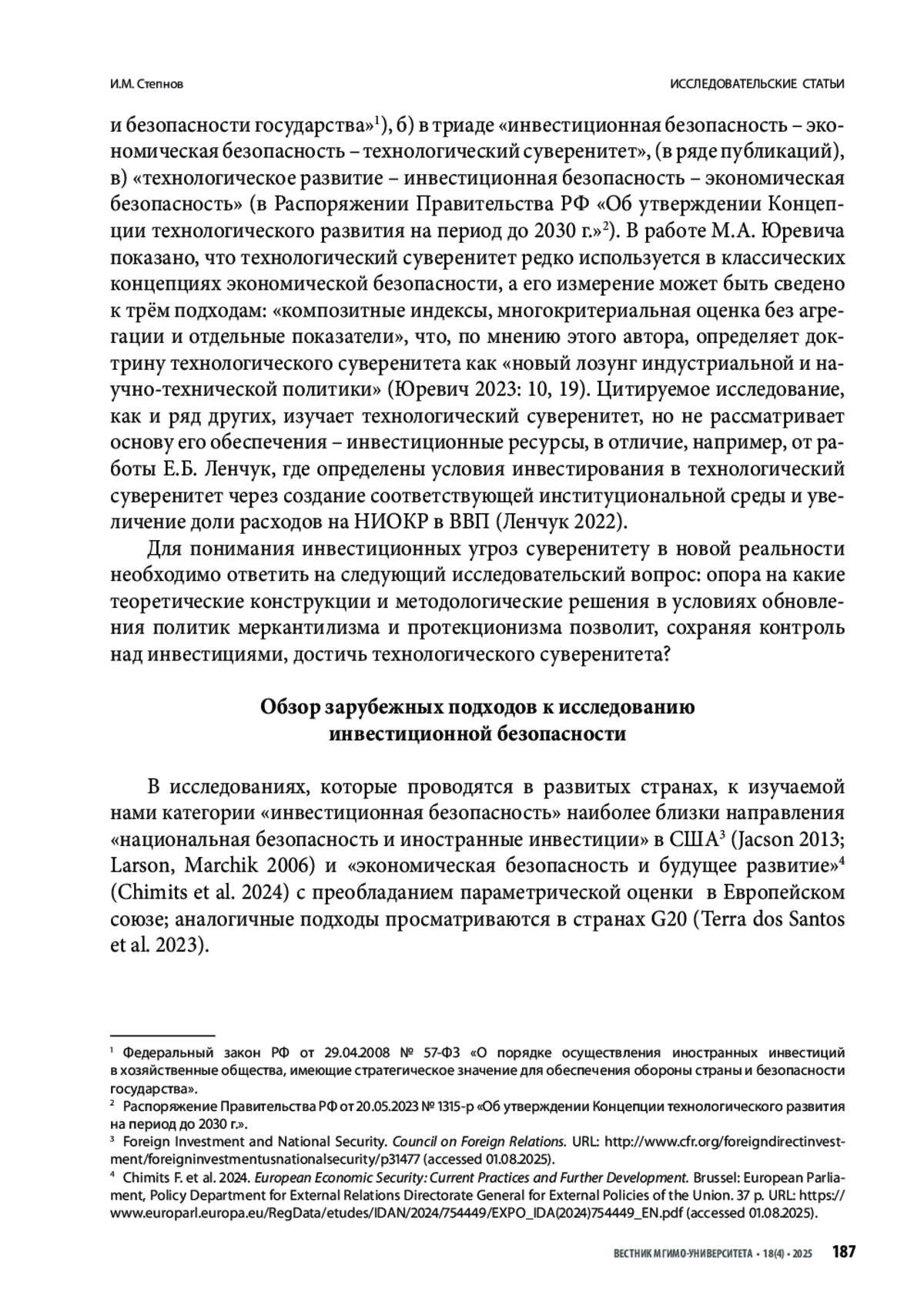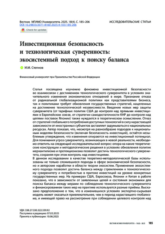 СТЕПНОВ И. М. ИНВЕСТИЦИОННАЯ БЕЗОПАСНОСТЬ И ТЕХНОЛОГИЧЕСКАЯ СУВЕРЕННОСТЬ: ЭКОСИСТЕМНЫЙ ПОДХОД К ПОИСКУ БАЛАНСА // ВЕСТНИК МГИМО-УНИВЕРСИТЕТА. 2025. ТОМ 18, № 4